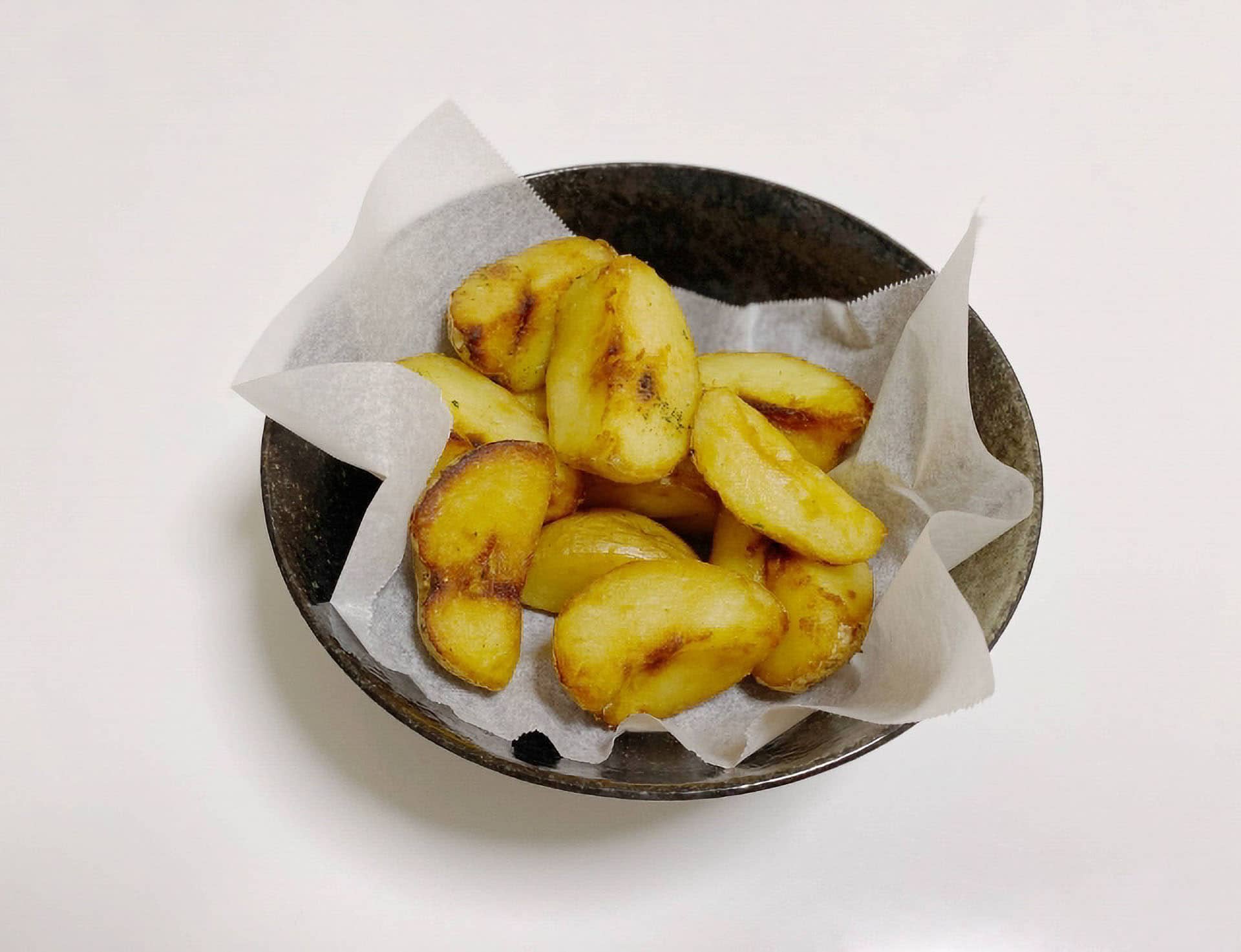 - オリーブオイル少量をフライパンに入れ予熱せずにジャガイモを揚げ焼く
