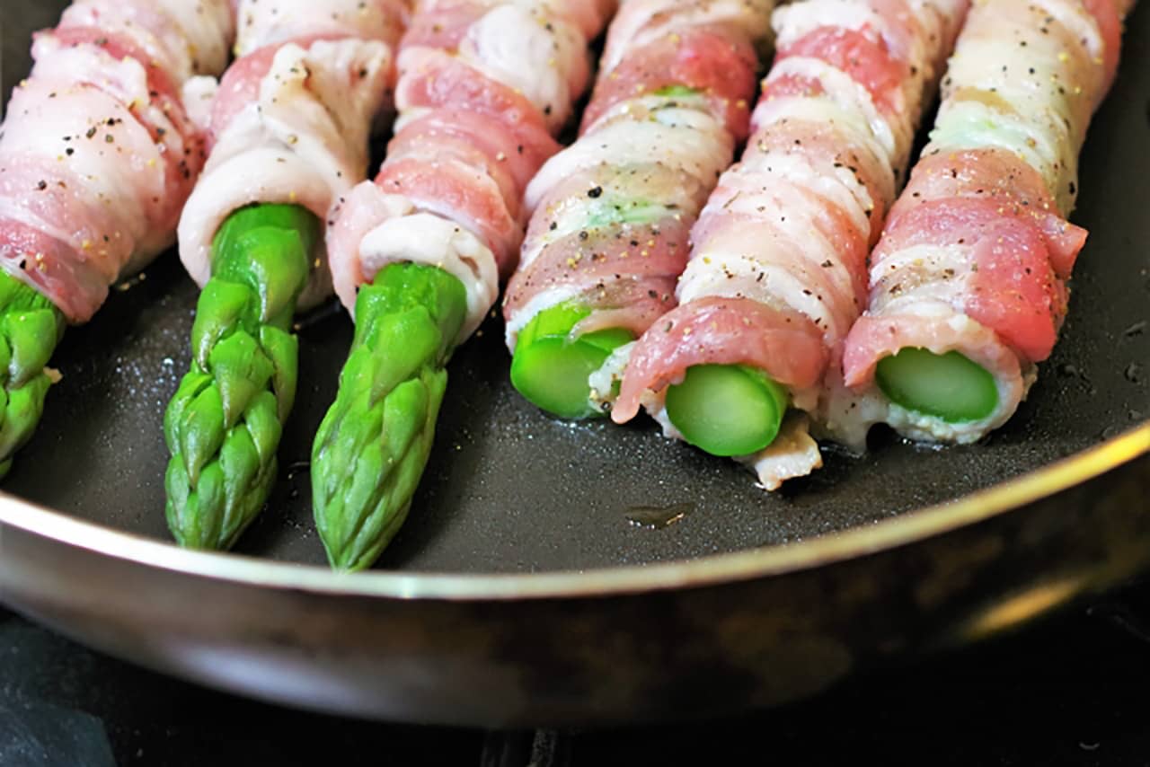 塩加減に注意 - 脂身がなるべく外側になるようにアスパラガスに巻きつける