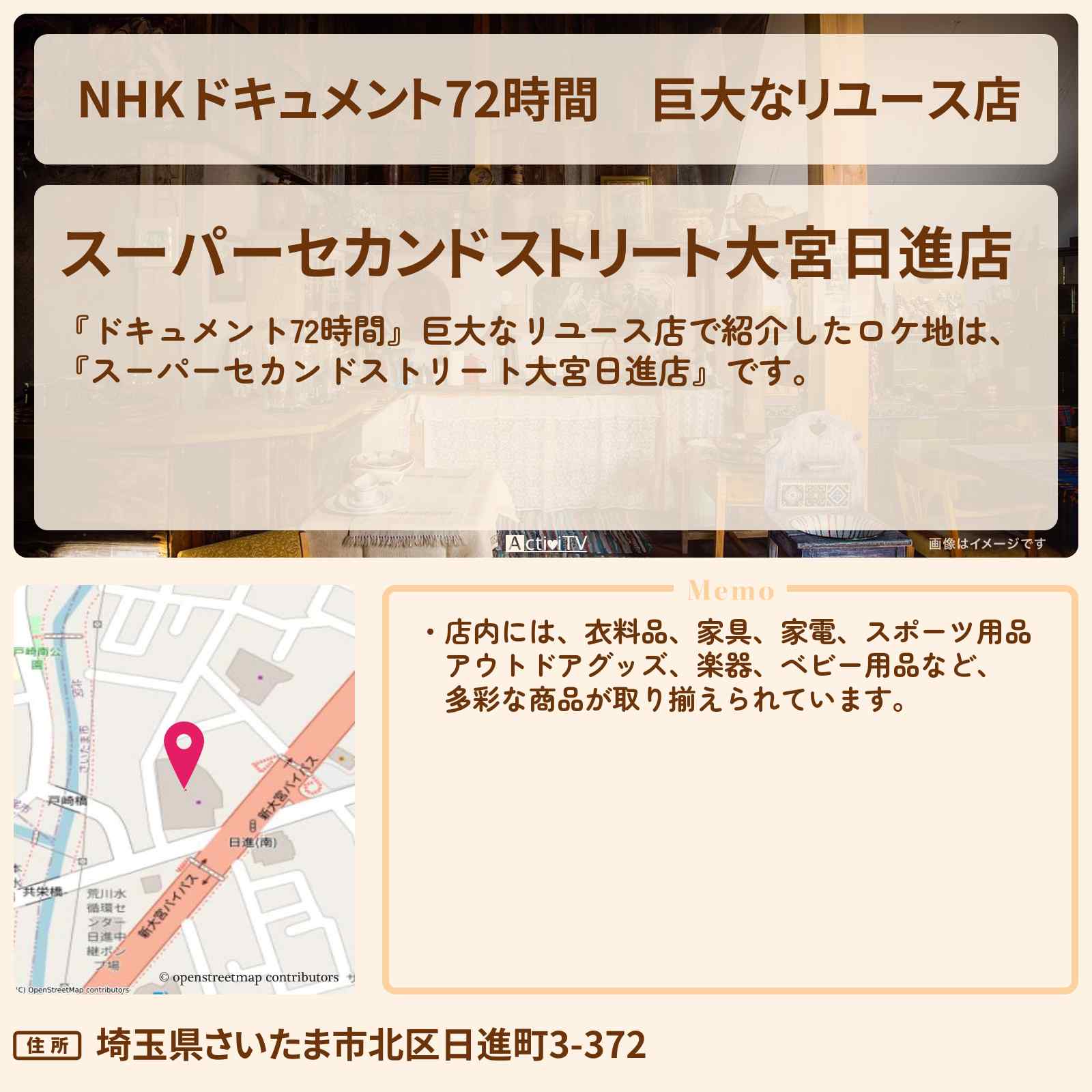 (金)放送の【ドキュメント72時間】巨大なリユース店で紹介したロケ地は、『スーパーセカンドストリート大宮日進店』です。