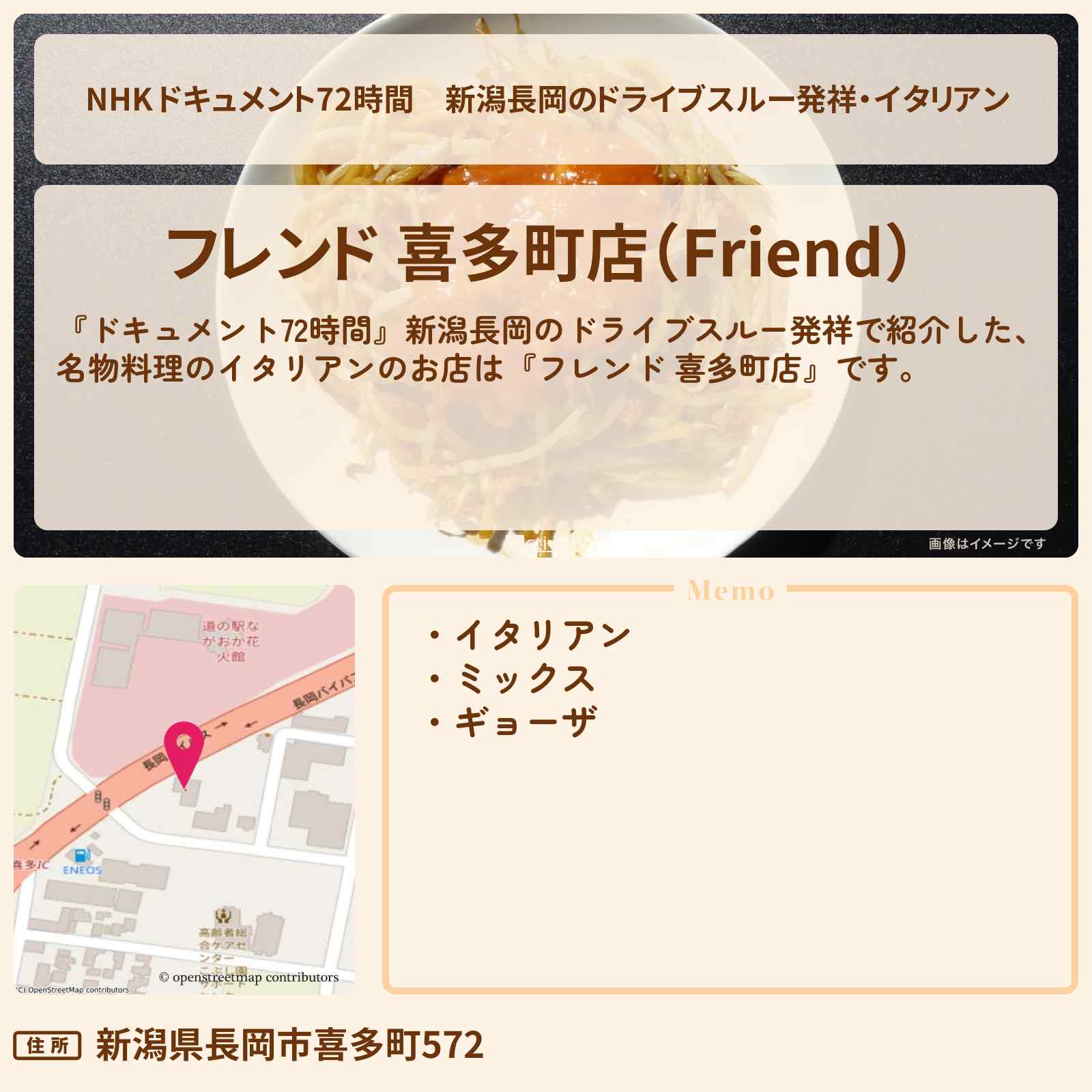 (金)放送の【ドキュメント72時間】新潟長岡のドライブスルー発祥で紹介した、名物料理のイタリアンのお店は『フレンド 喜多町店』です。