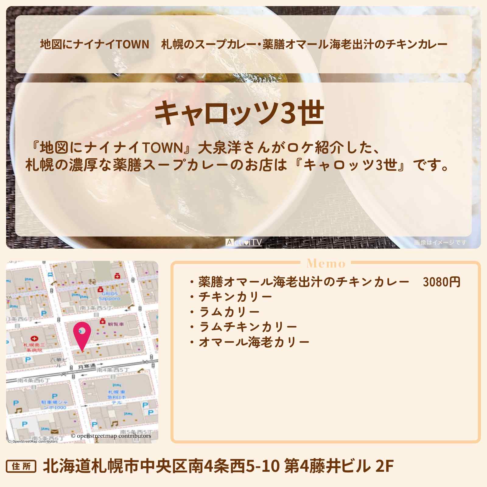 放送の【地図にナイナイTOWN】大泉洋さんがロケ紹介した、札幌の濃厚な薬膳スープカレーのお店は『キャロッツ3世』です。