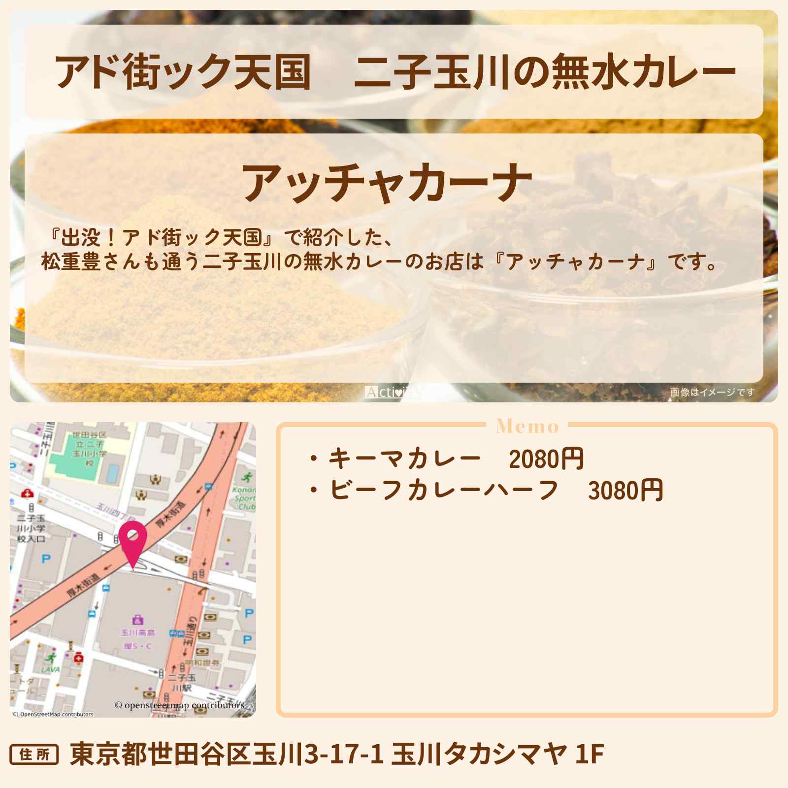 放送の【出没!アド街ック天国】で紹介した、松重豊さんも通う二子玉川の無水カレーのお店は『アッチャカーナ』です。