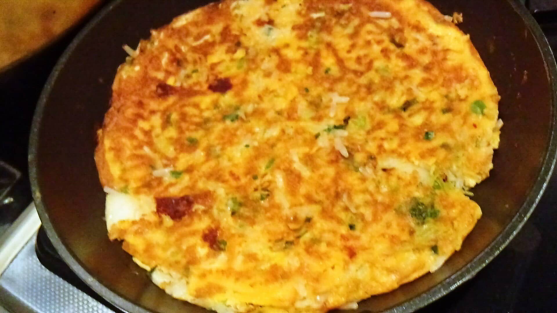 - フライパンにサラダ油を温め、生地を入れたら平たく広げて、弱めの中火でフタをして3〜4分焼く