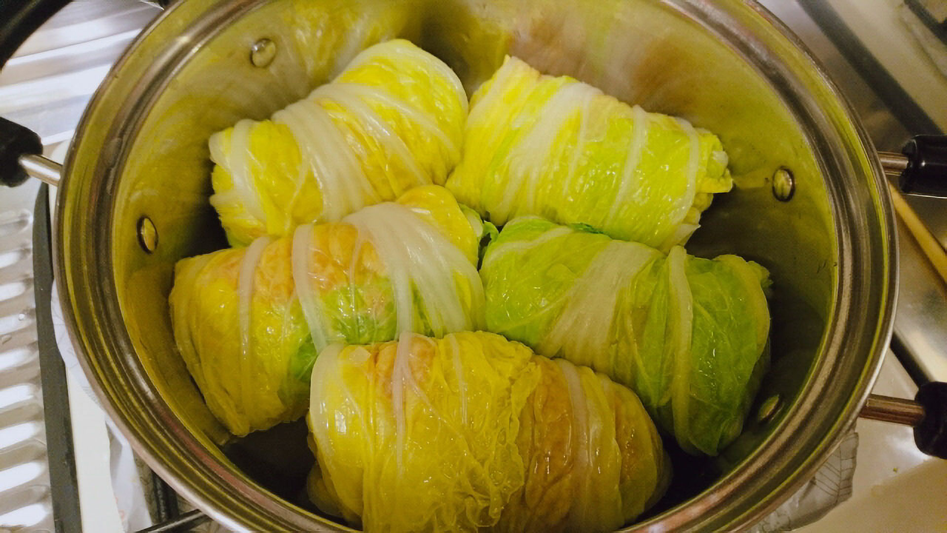 - いわしの骨を湯通しして昆布と一緒に鍋に敷く。その上にロールレタスを並べて水を入れ、薄口しょう油を加えて落し蓋をし、中火にかける。沸騰したら弱火で5分煮込み、中まで火を通す