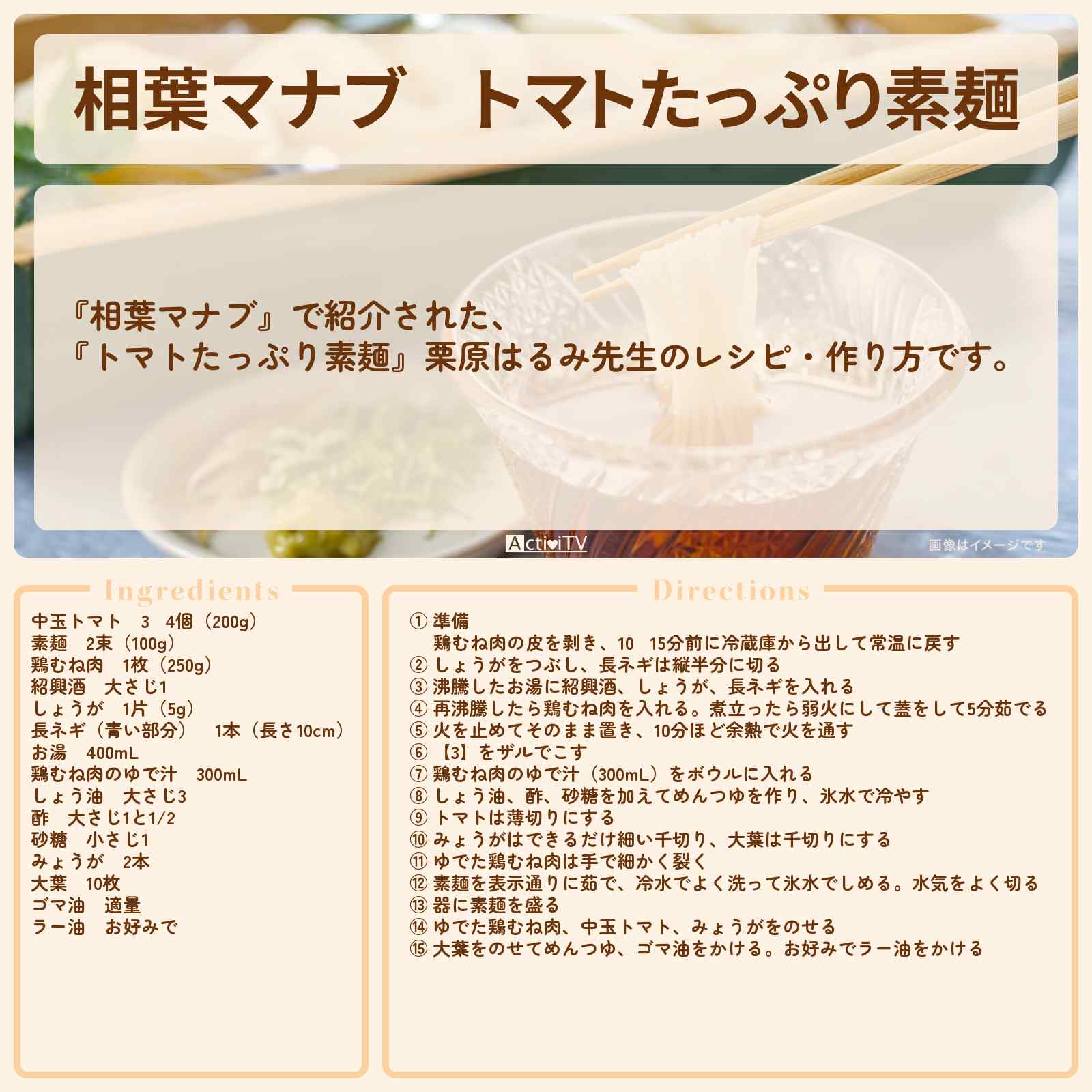 放送の【相葉マナブ】で紹介された、『トマトたっぷり素麺』栗原はるみ先生のレシピ・作り方です。
