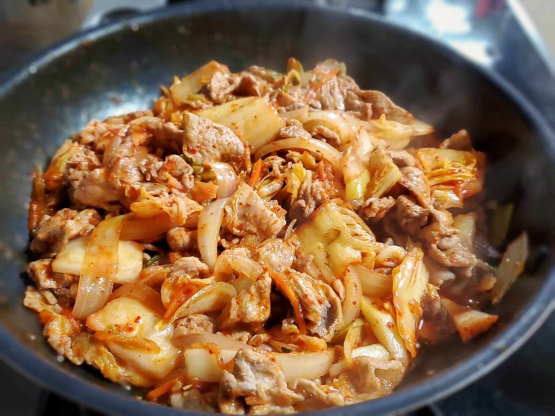 豚バラ薄切り肉 3~4cm幅に切る - 火をつけないフライパンにキムチ、ケチャップ、めんつゆ、豚バラ薄切り肉を合わせて混ぜる