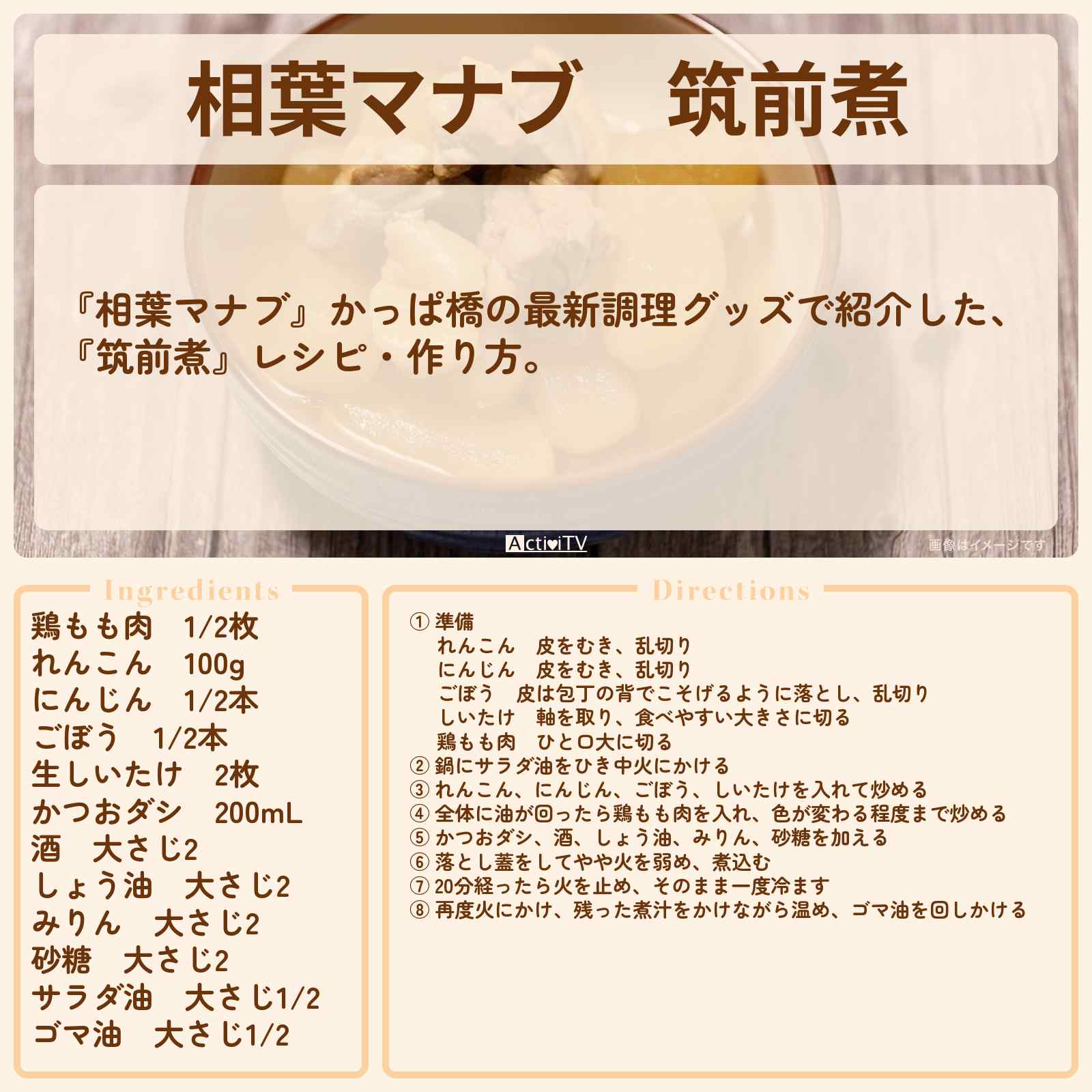放送の【相葉マナブ】かっぱ橋の最新調理グッズで紹介した、『筑前煮』レシピ・作り方。