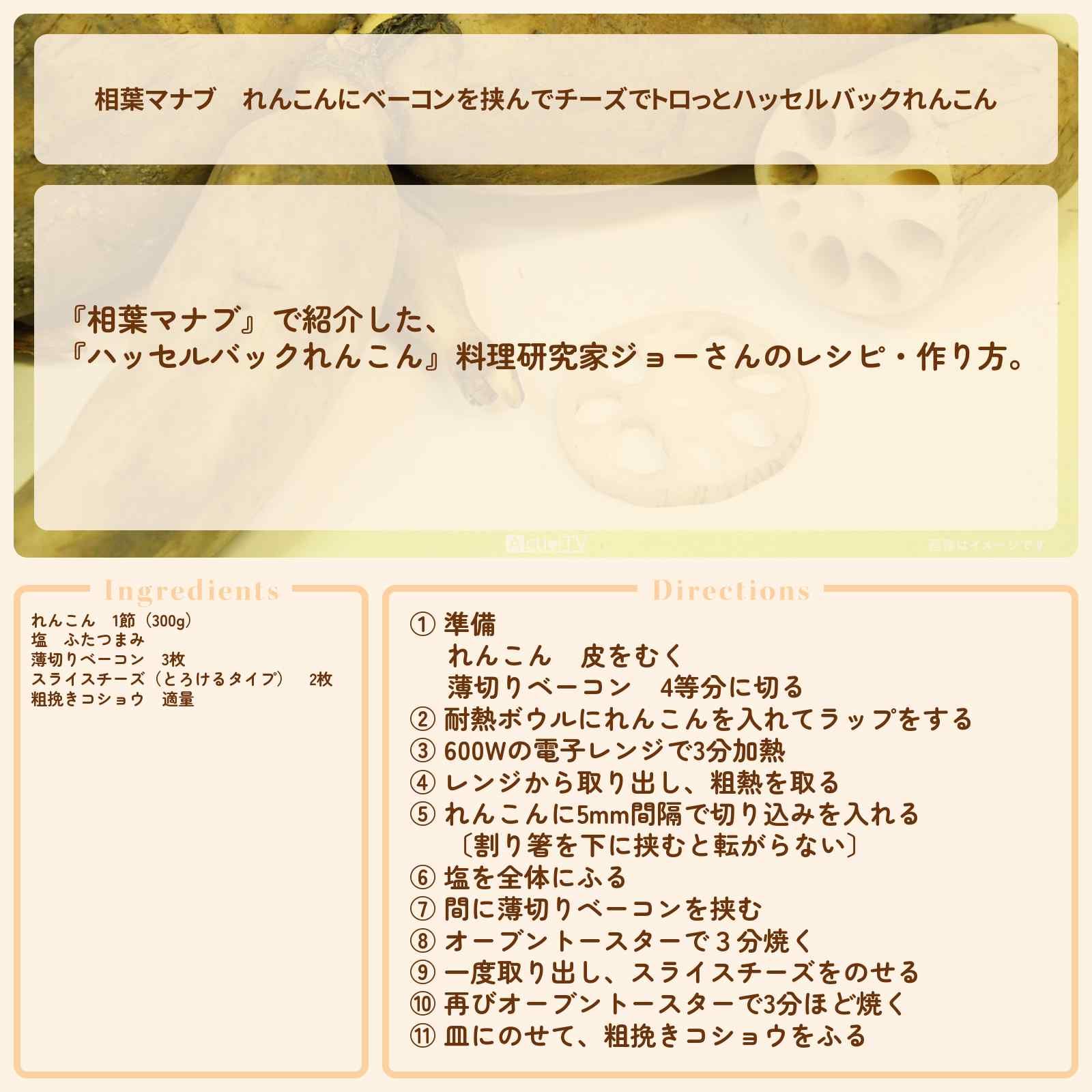 放送の【相葉マナブ】で紹介した、『ハッセルバックれんこん』料理研究家ジョーさんのレシピ・作り方。