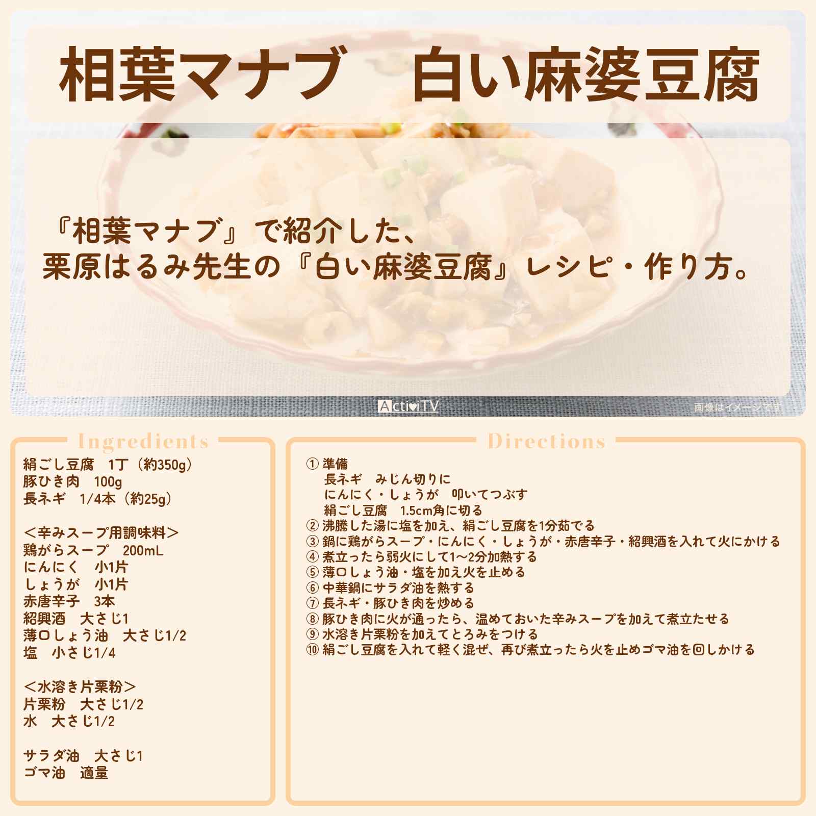 放送の【相葉マナブ】で紹介した、栗原はるみ先生の『白い麻婆豆腐』レシピ・作り方。