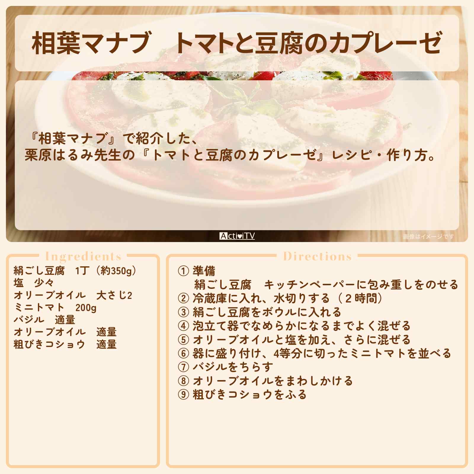 放送の【相葉マナブ】で紹介した、栗原はるみ先生の『トマトと豆腐のカプレーゼ』レシピ・作り方。