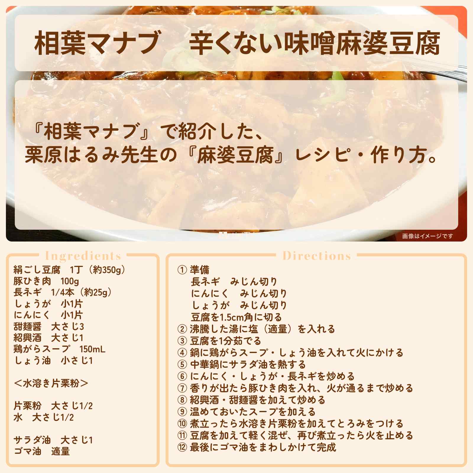 放送の【相葉マナブ】で紹介した、栗原はるみ先生の『麻婆豆腐』レシピ・作り方。