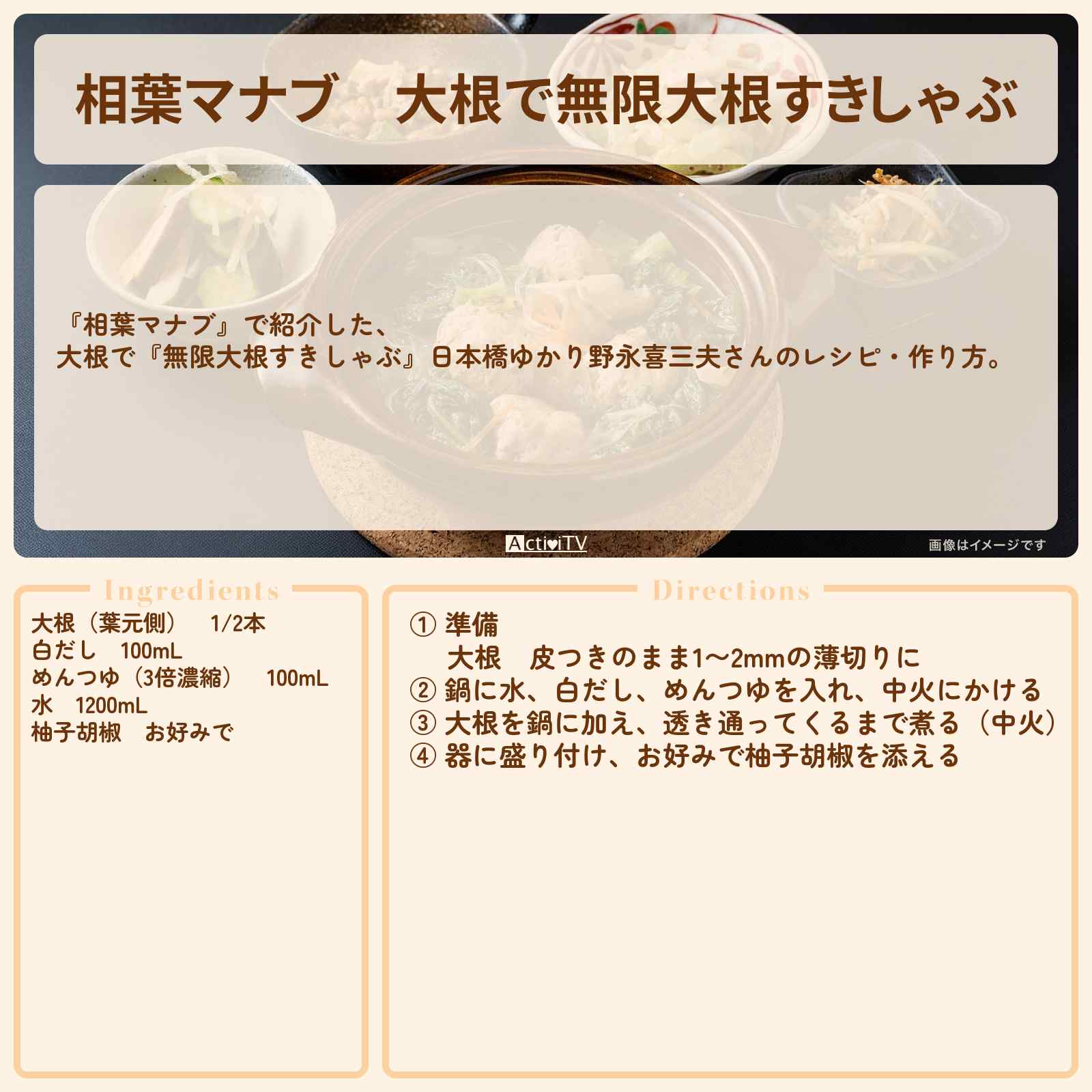 放送の【相葉マナブ】で紹介した、大根で『無限大根すきしゃぶ』日本橋ゆかり野永喜三夫さんのレシピ・作り方。