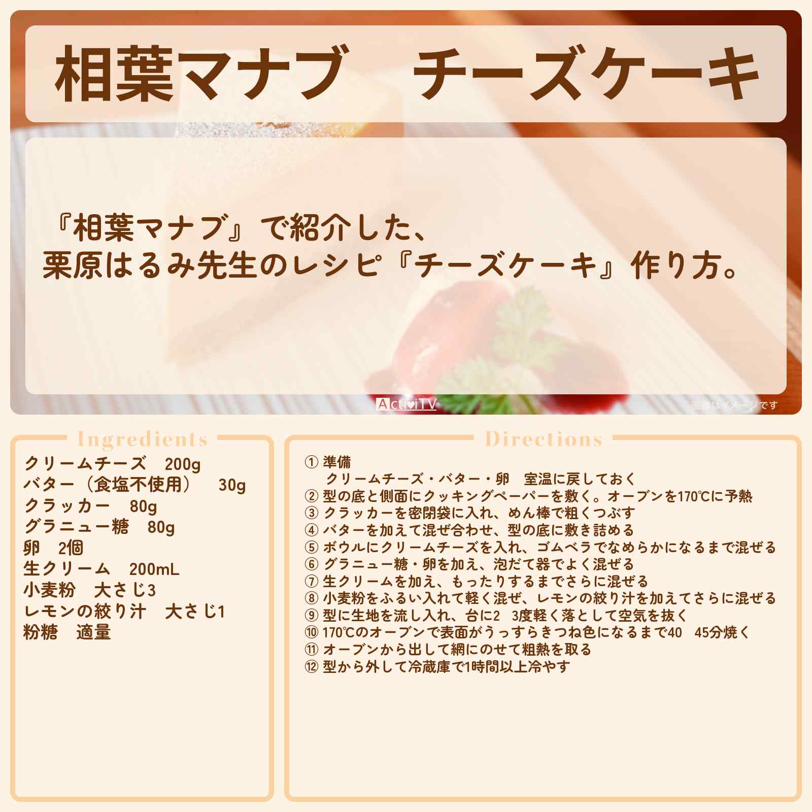 放送の【相葉マナブ】で紹介した、栗原はるみ先生のレシピ『チーズケーキ』作り方。