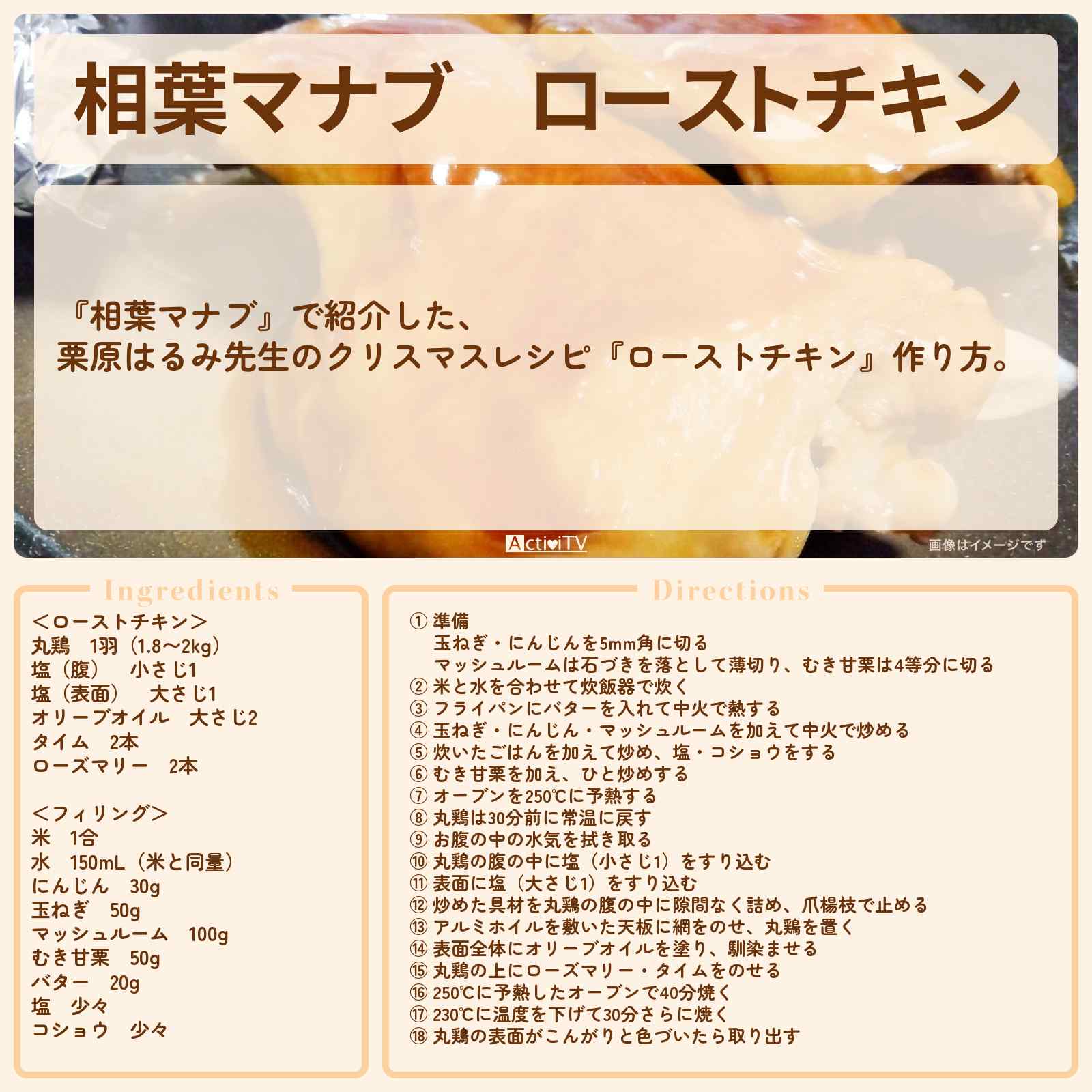 放送の【相葉マナブ】で紹介した、栗原はるみ先生のクリスマスレシピ『ローストチキン』作り方。