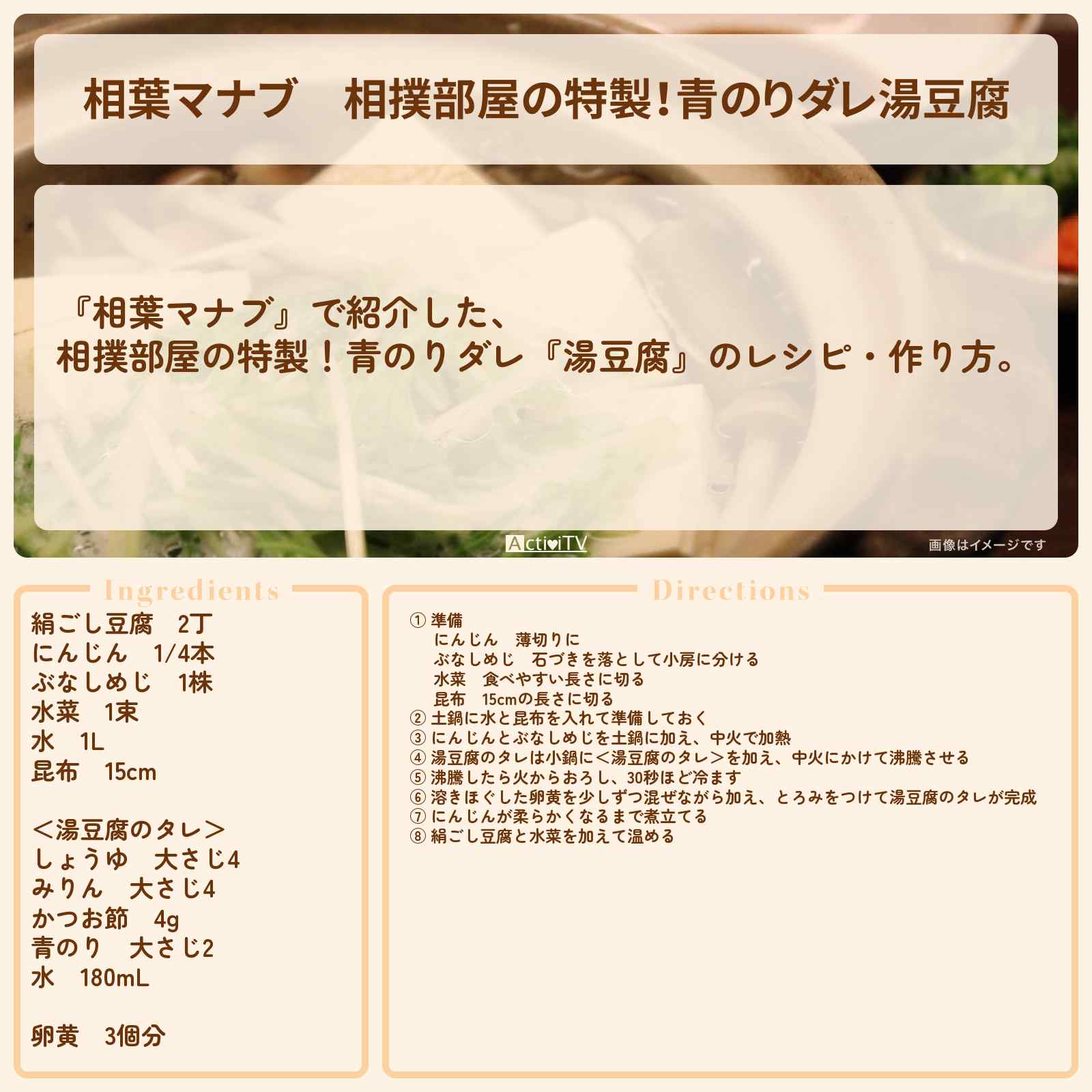放送の【相葉マナブ】で紹介した、相撲部屋の特製!青のりダレ『湯豆腐』のレシピ・作り方。