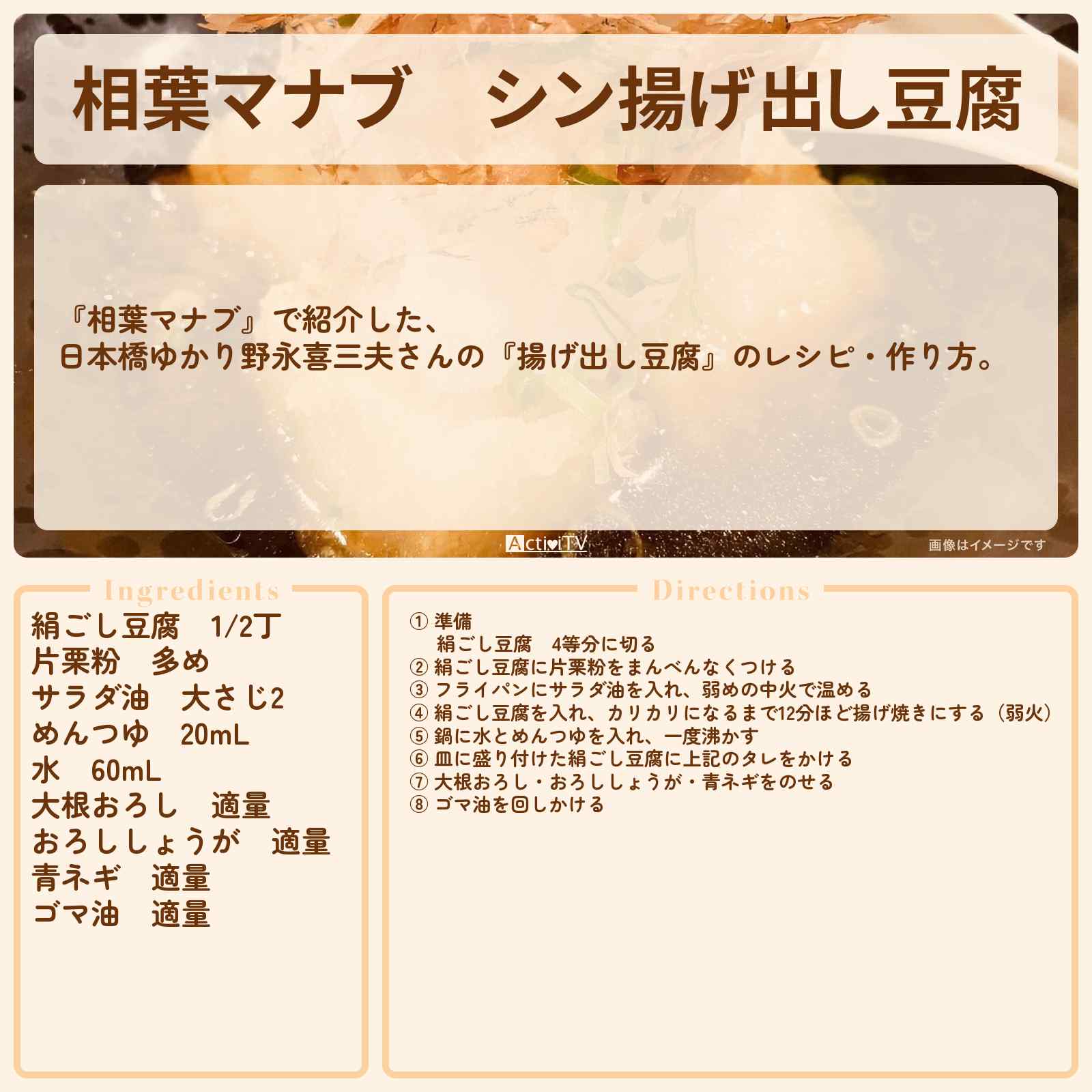 放送の【相葉マナブ】で紹介した、日本橋ゆかり野永喜三夫さんの『揚げ出し豆腐』のレシピ・作り方。