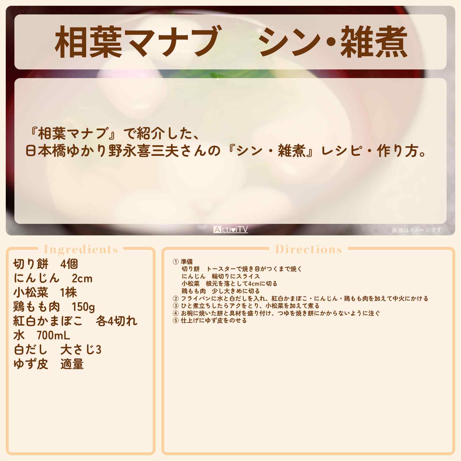 放送の【相葉マナブ】で紹介した、日本橋ゆかり野永喜三夫さんの『シン・雑煮』レシピ・作り方。