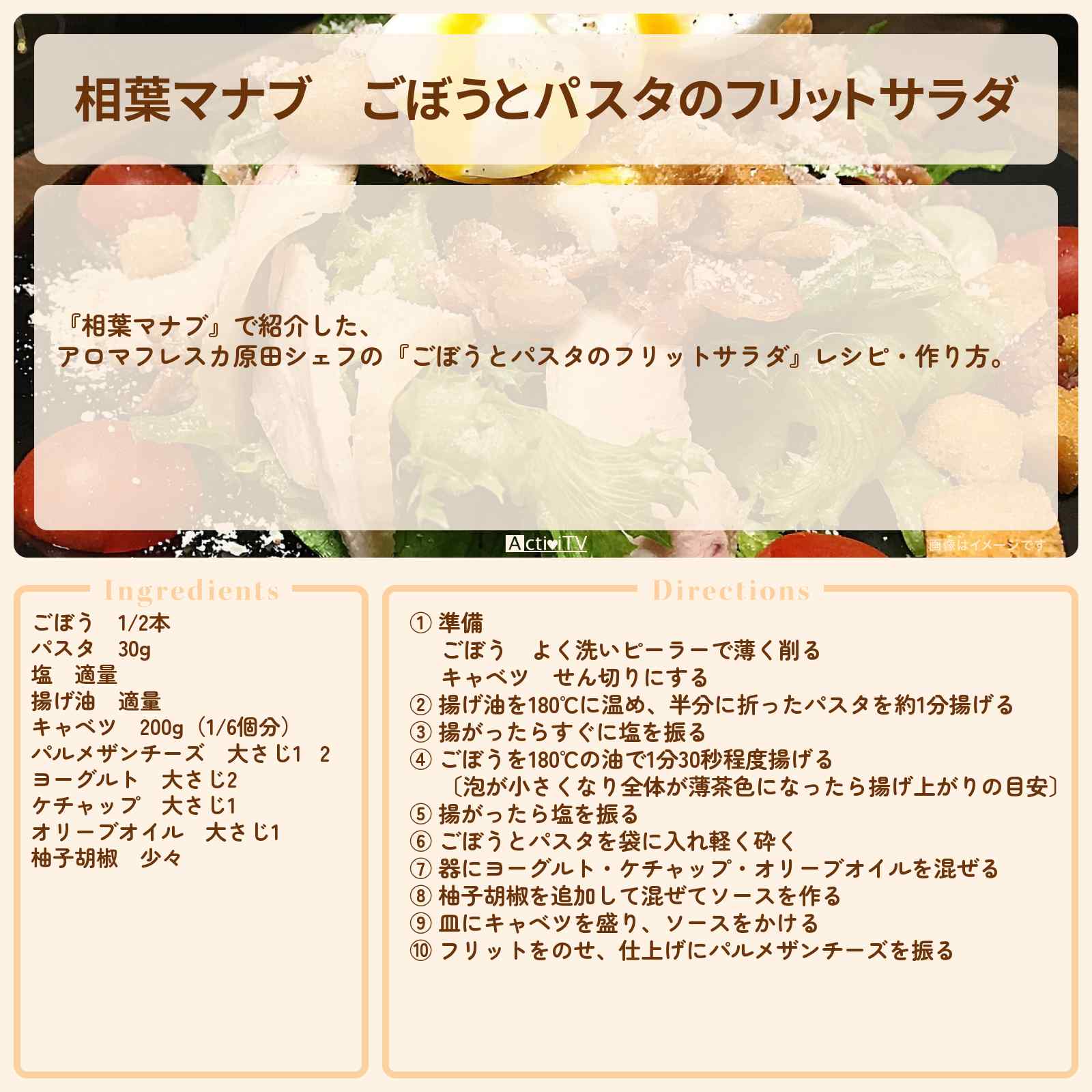 放送の【相葉マナブ】で紹介した、アロマフレスカ原田シェフの『ごぼうとパスタのフリットサラダ』レシピ・作り方。