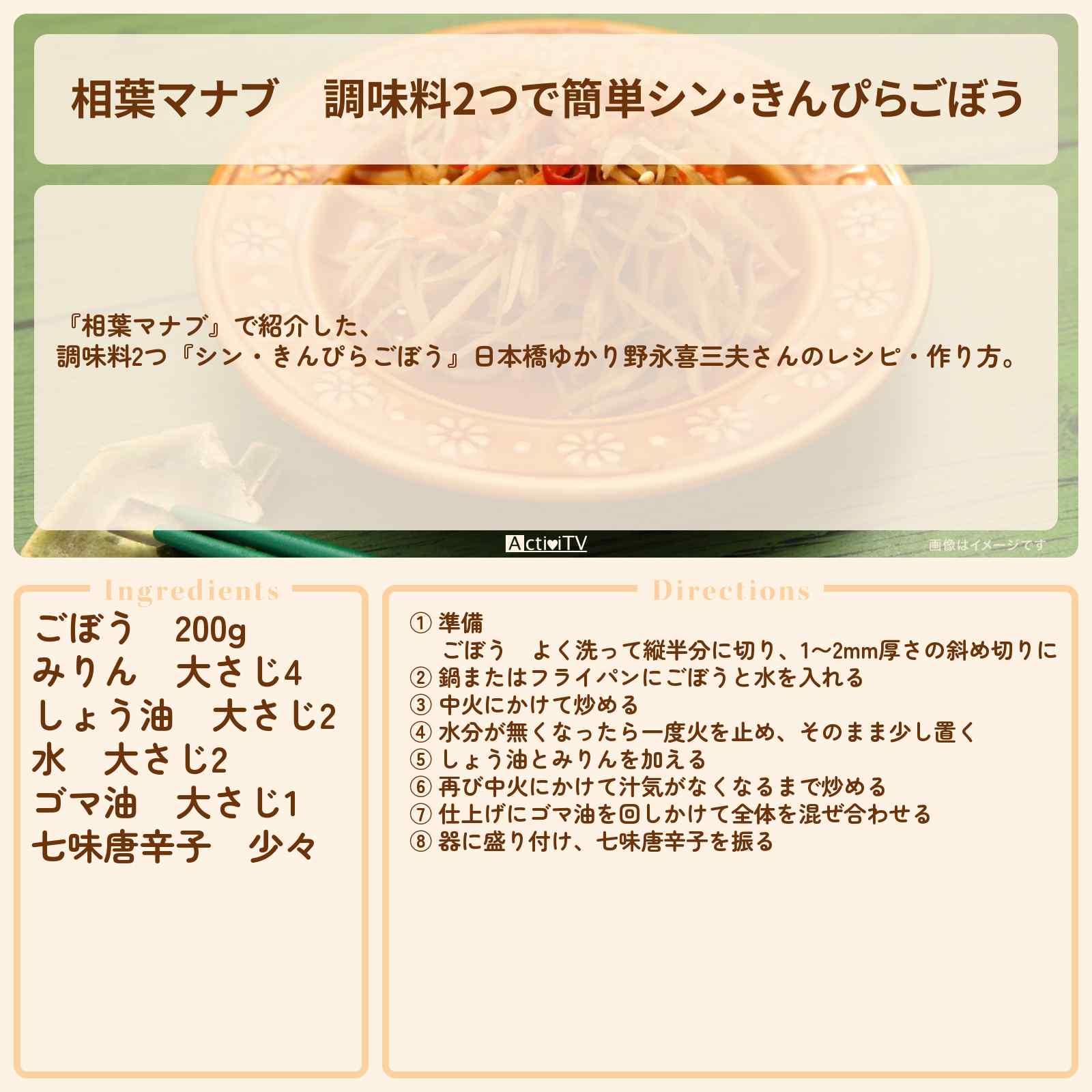放送の【相葉マナブ】で紹介した、調味料2つ『シン・きんぴらごぼう』日本橋ゆかり野永喜三夫さんのレシピ・作り方。