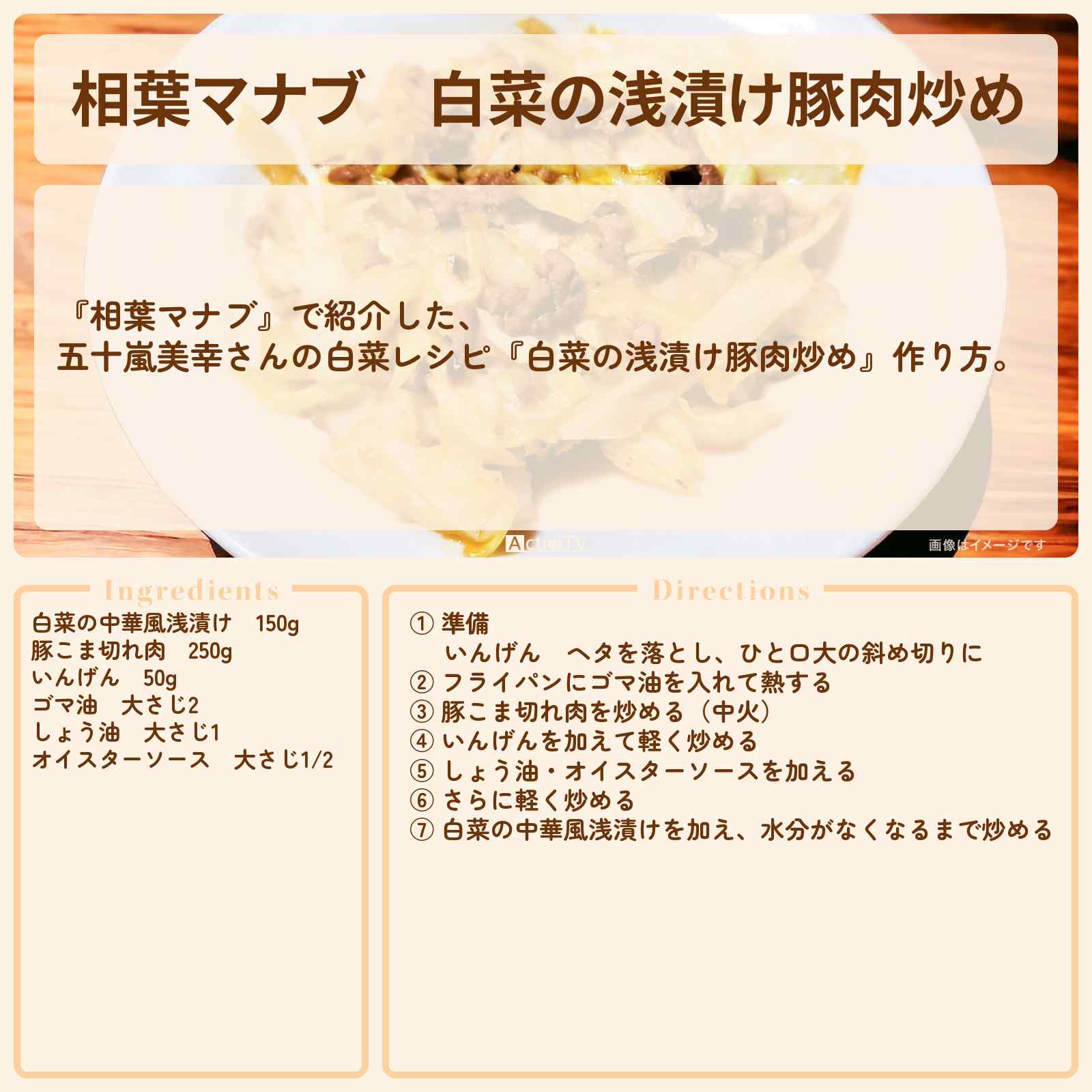 放送の【相葉マナブ】で紹介した、五十嵐美幸さんの白菜レシピ『白菜の浅漬け豚肉炒め』作り方。