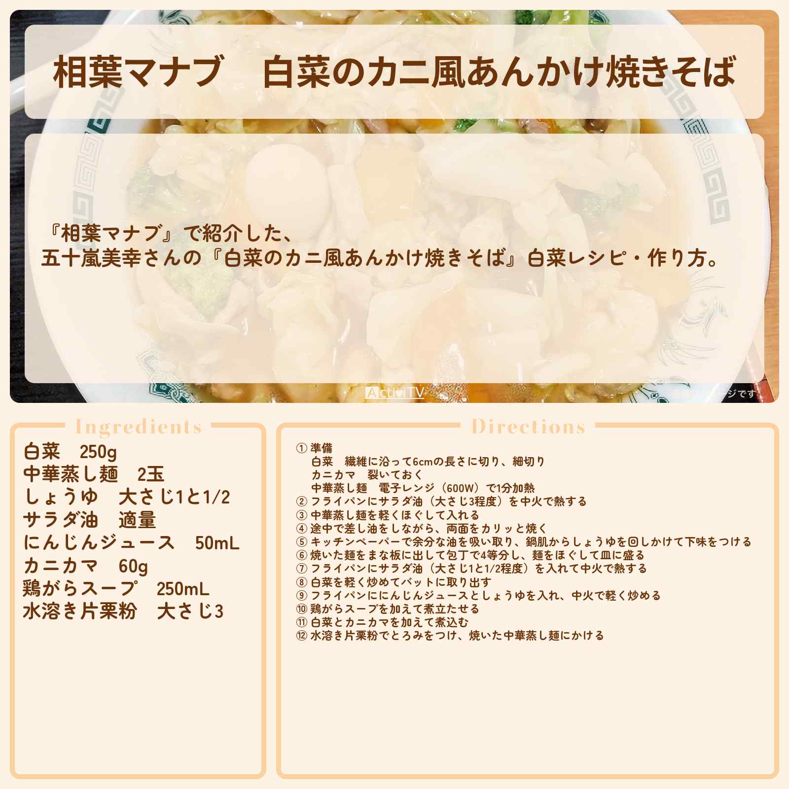 放送の【相葉マナブ】で紹介した、五十嵐美幸さんの『白菜のカニ風あんかけ焼きそば』白菜レシピ・作り方。