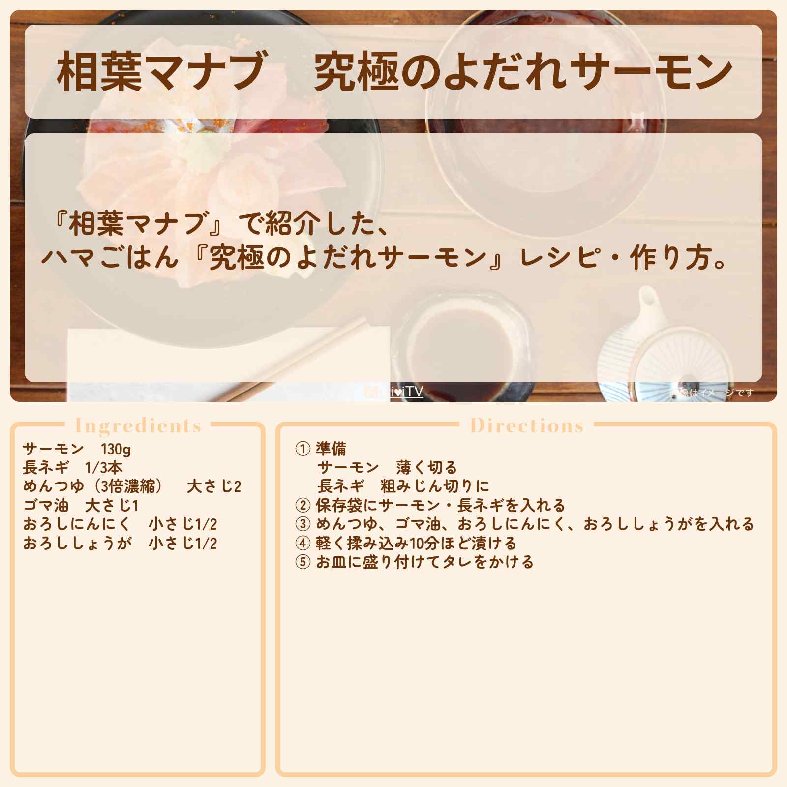 放送の【相葉マナブ】で紹介した、ハマごはん『究極のよだれサーモン』レシピ・作り方。