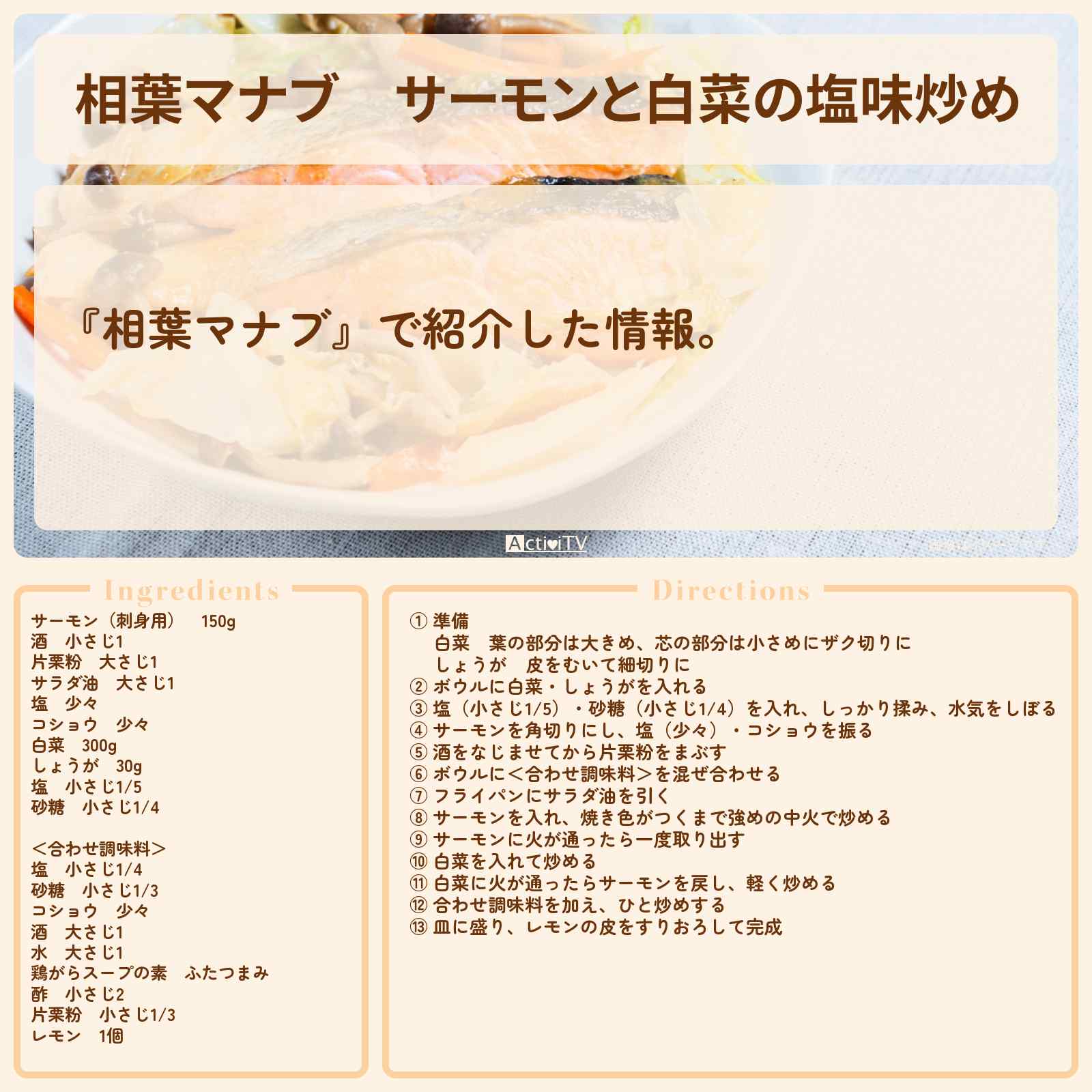- 白菜に火が通ったらサーモンを戻し、軽く炒める