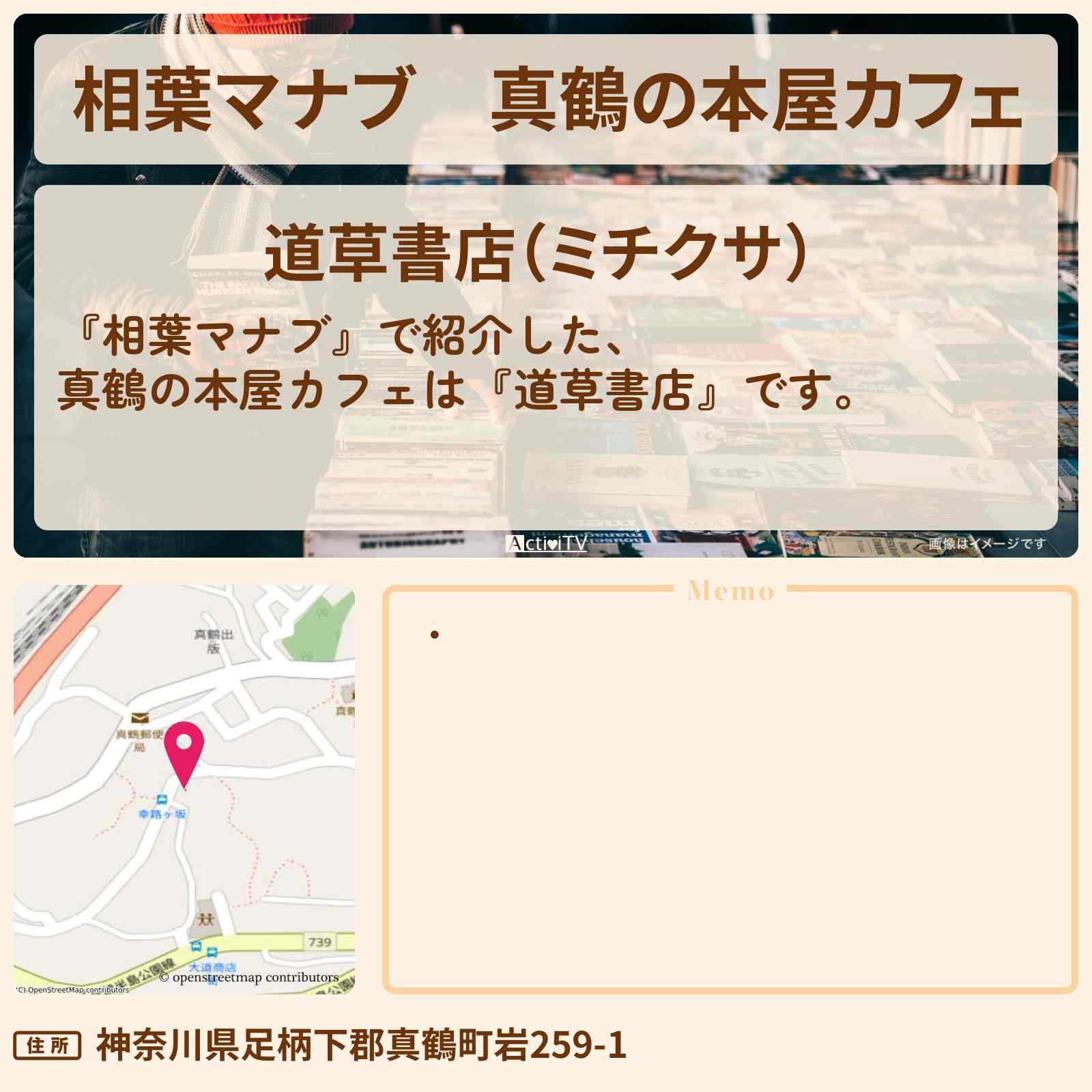 放送の【相葉マナブ】で紹介した、真鶴の本屋カフェは『道草書店』です。