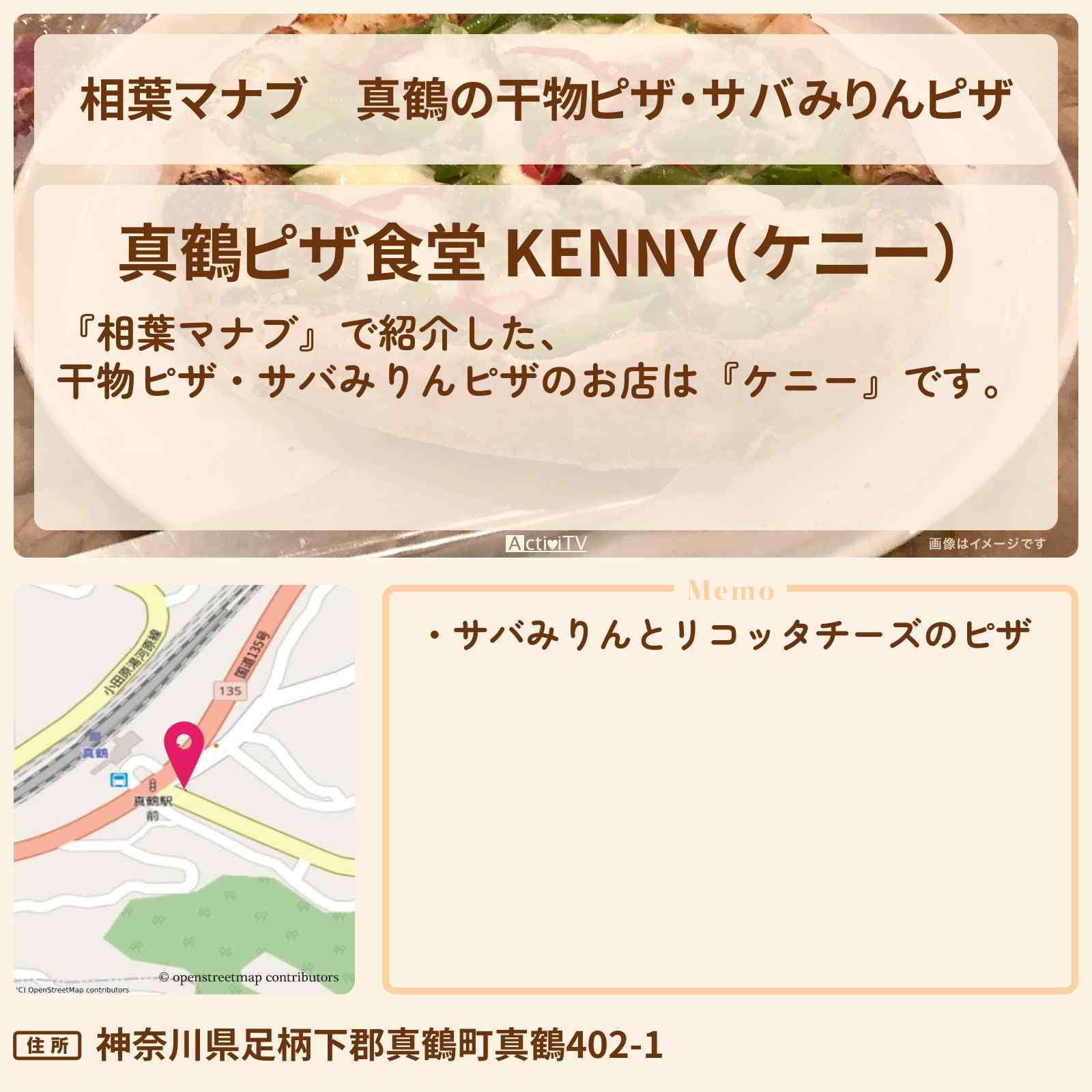 放送の【相葉マナブ】で紹介した、干物ピザ・サバみりんピザのお店は『ケニー』です。