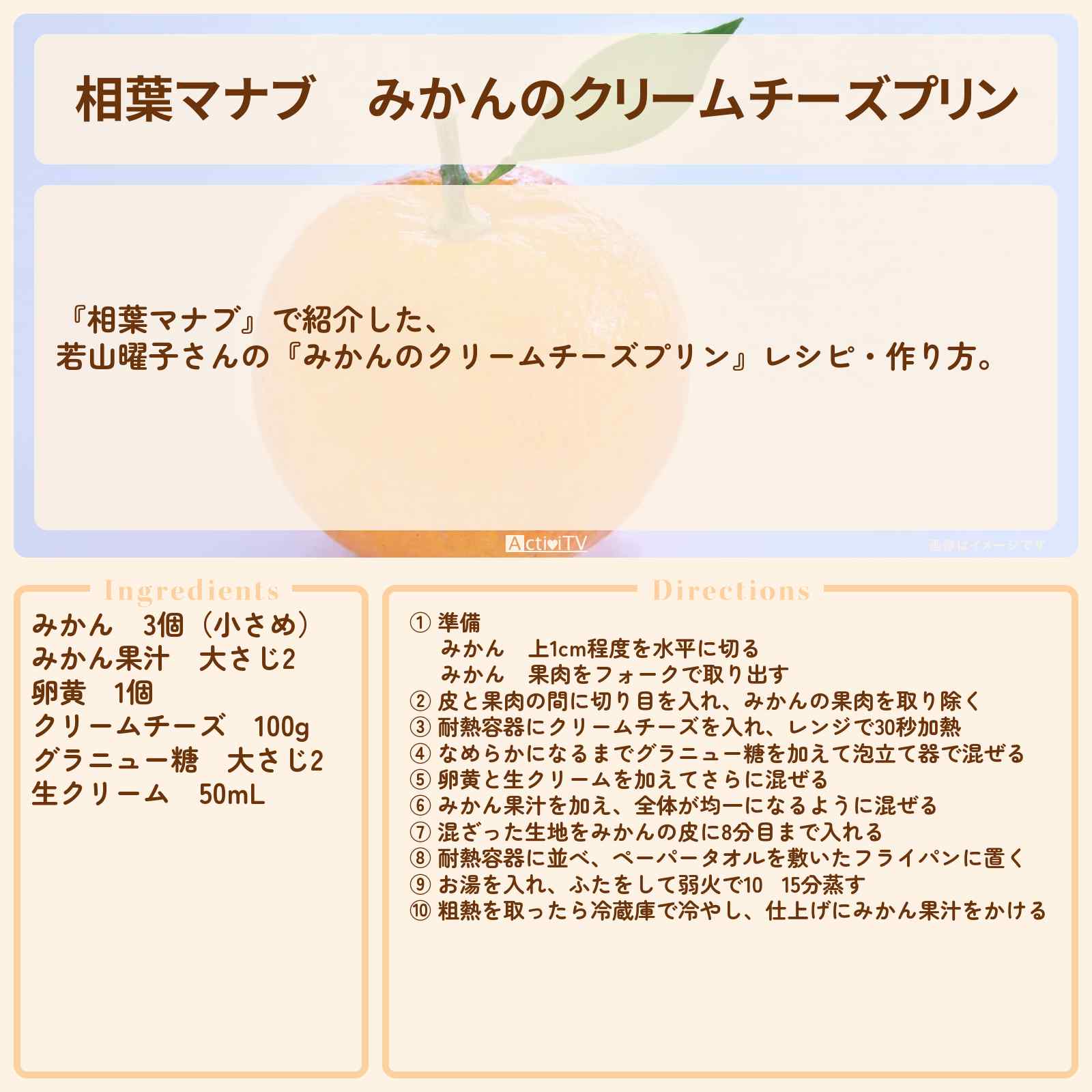 放送の【相葉マナブ】で紹介した、若山曜子さんの『みかんのクリームチーズプリン』レシピ・作り方。