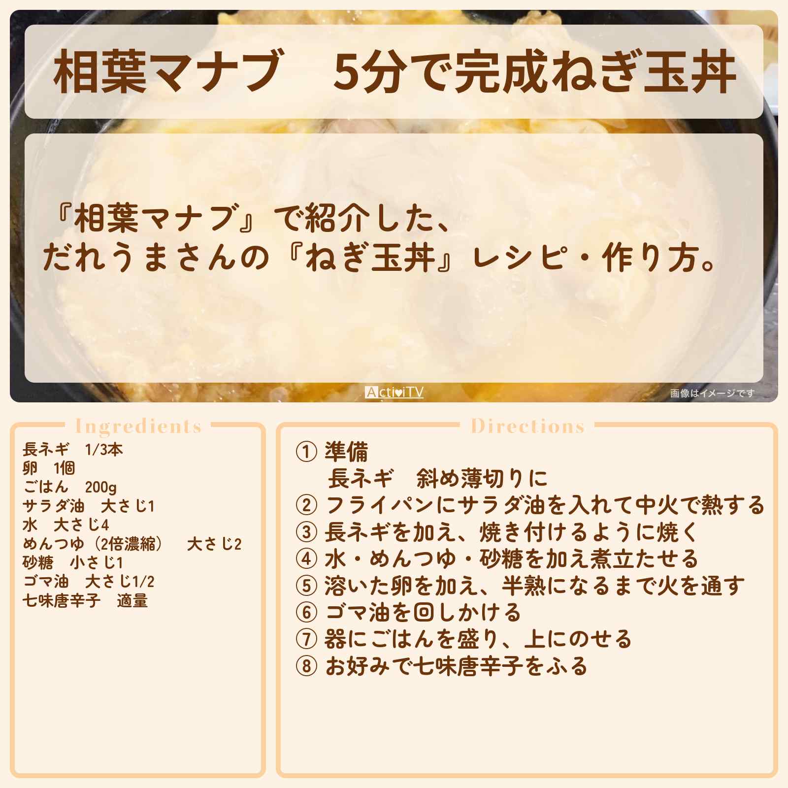 放送の【相葉マナブ】で紹介した、だれうまさんの『ねぎ玉丼』レシピ・作り方。