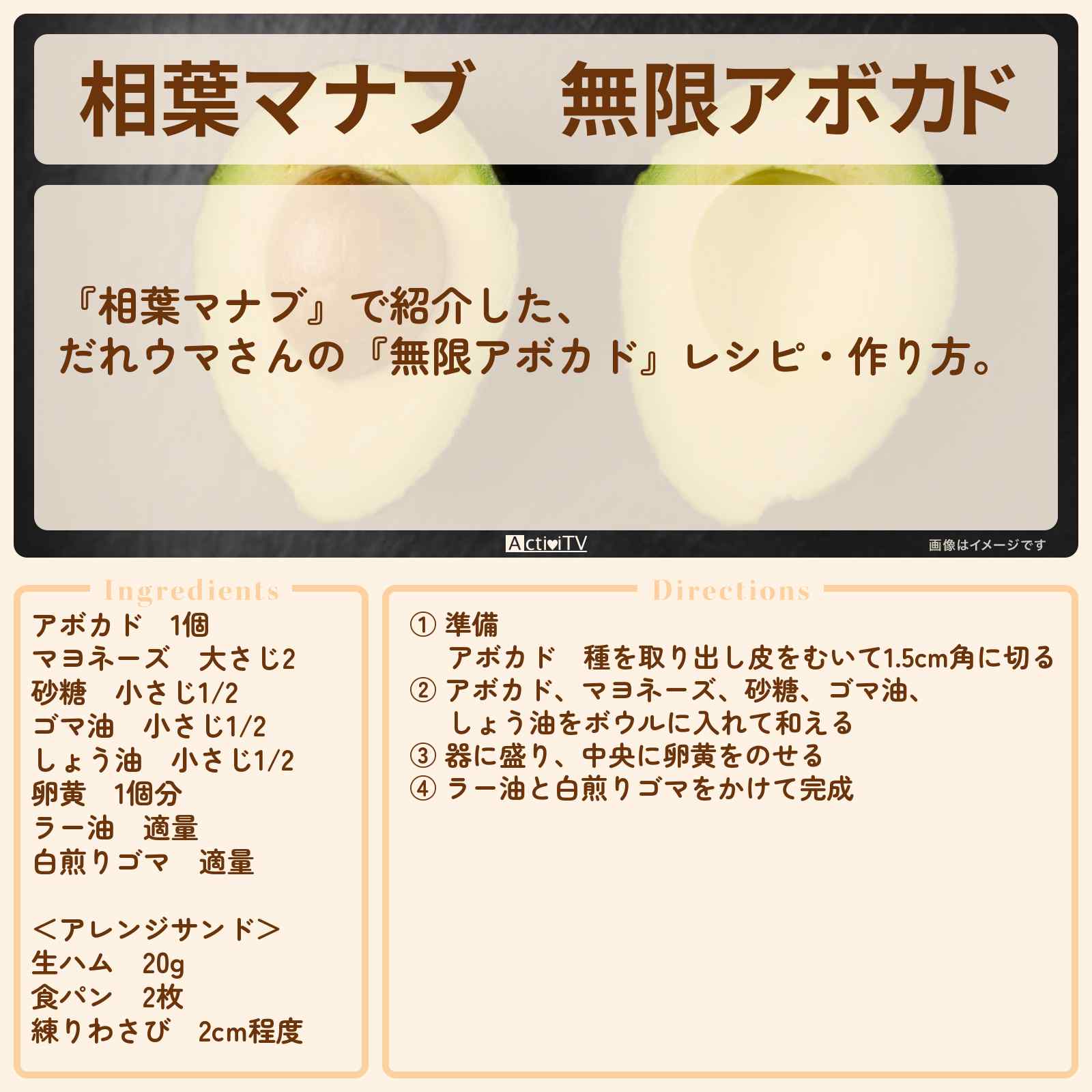 放送の【相葉マナブ】で紹介した、だれウマさんの『無限アボカド』レシピ・作り方。