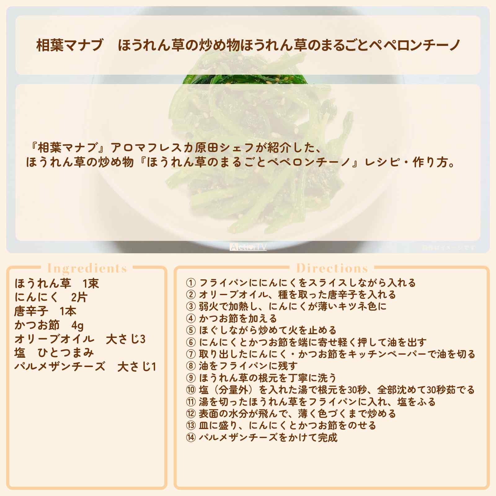 放送の【相葉マナブ】アロマフレスカ原田シェフが紹介した、ほうれん草の炒め物『ほうれん草のまるごとペペロンチーノ』レシピ・作り方。
