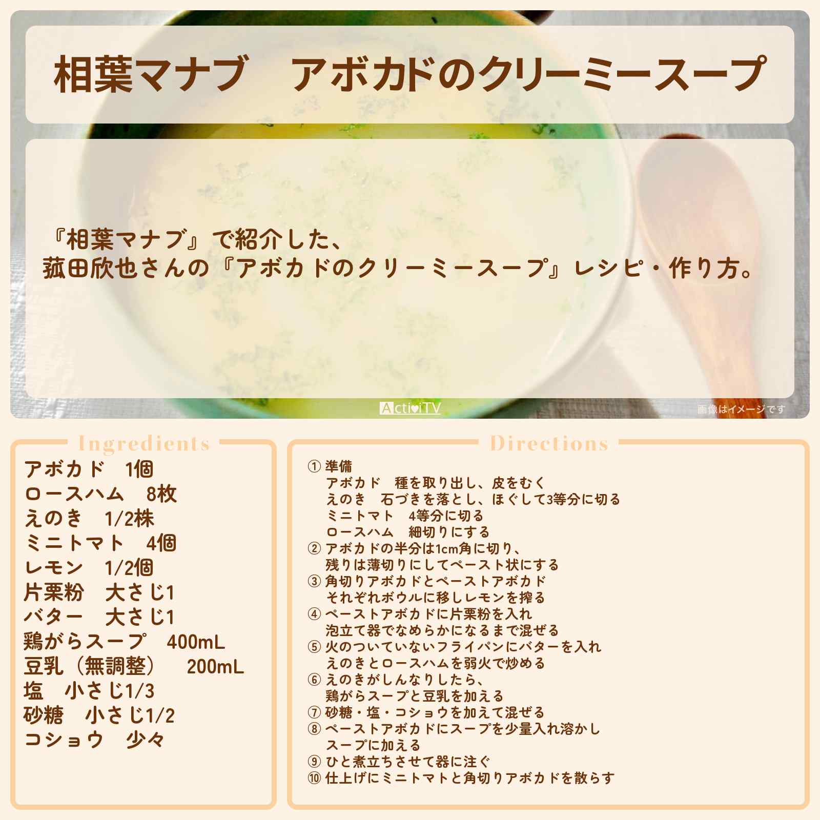 放送の【相葉マナブ】で紹介した、菰田欣也さんの『アボカドのクリーミースープ』レシピ・作り方。
