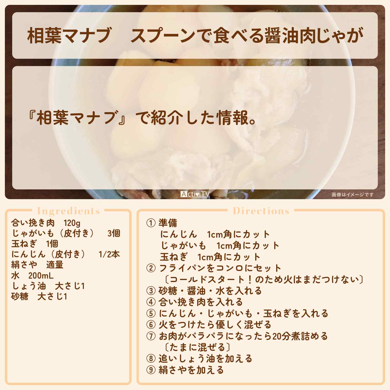 スプーンで食べるしょう油肉じゃがは、合い挽き肉を使うことでとろみが出て、野菜との一体感が楽しめる一品です。じゃがいも・にんじん・玉ねぎを1cm角に切ることで、食べやすく、味もしっかり染み込みます。しょう油と砂糖で味付けするシンプルな和風味は、ごはんとの相性も抜群。