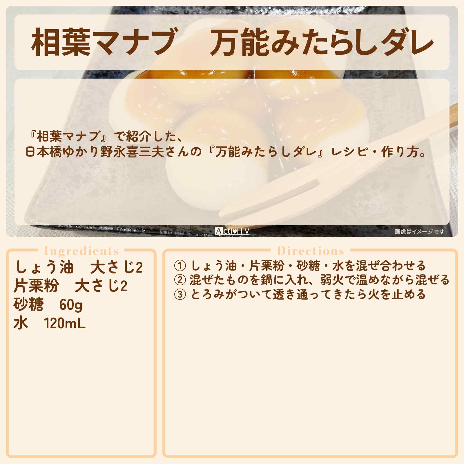 放送の【相葉マナブ】で紹介した、日本橋ゆかり野永喜三夫さんの『万能みたらしダレ』レシピ・作り方。