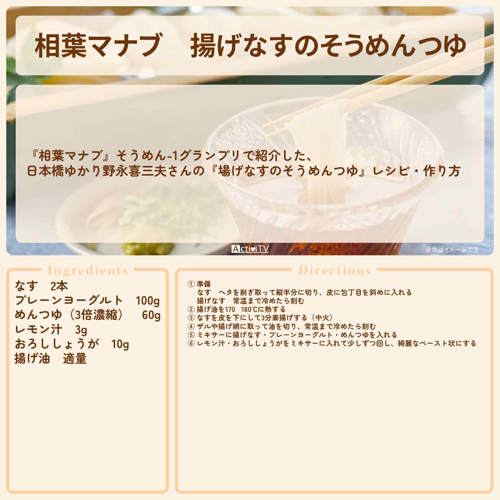 放送の【相葉マナブ】そうめん-1グランプリで紹介した、日本橋ゆかり野永喜三夫さんの『場げなすのそうめんつゆ』レシピ・作り方