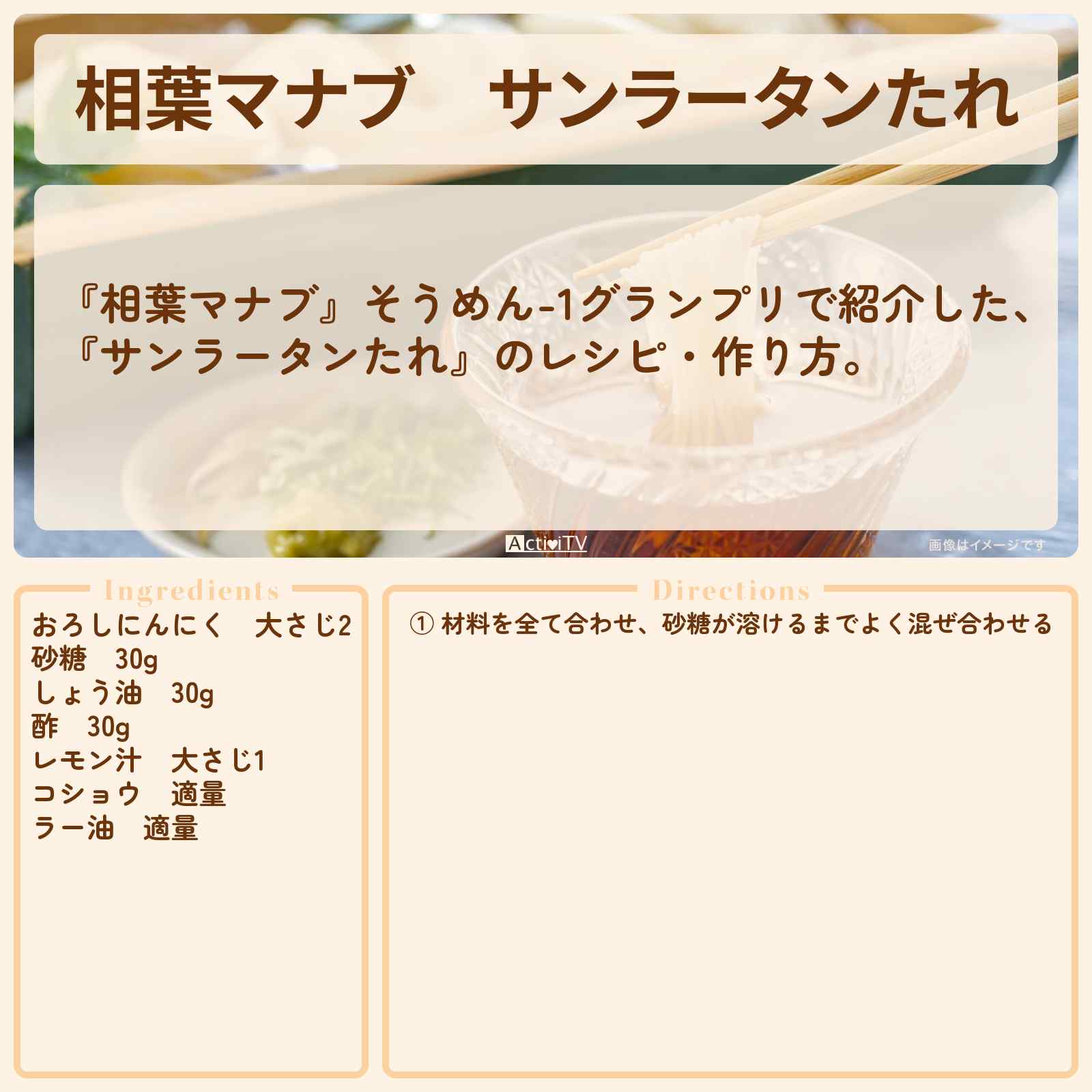 放送の【相葉マナブ】そうめん-1グランプリで紹介した、『サンラータンたれ』のレシピ・作り方。