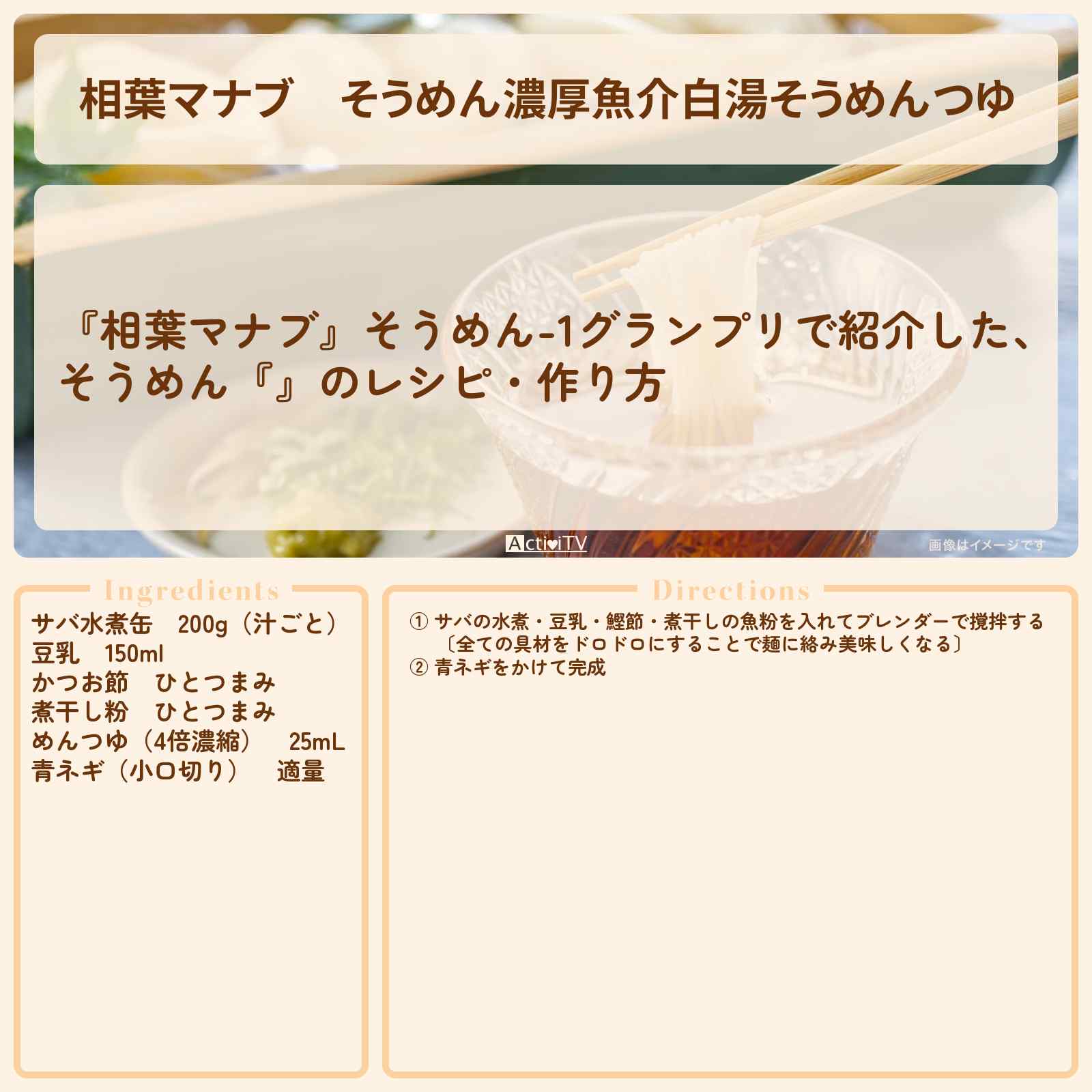 2025年9月28日放送の【相葉マナブ】そうめん-1グランプリで紹介した、そうめん『魚介マヨつけ汁』のレシピ・作り方