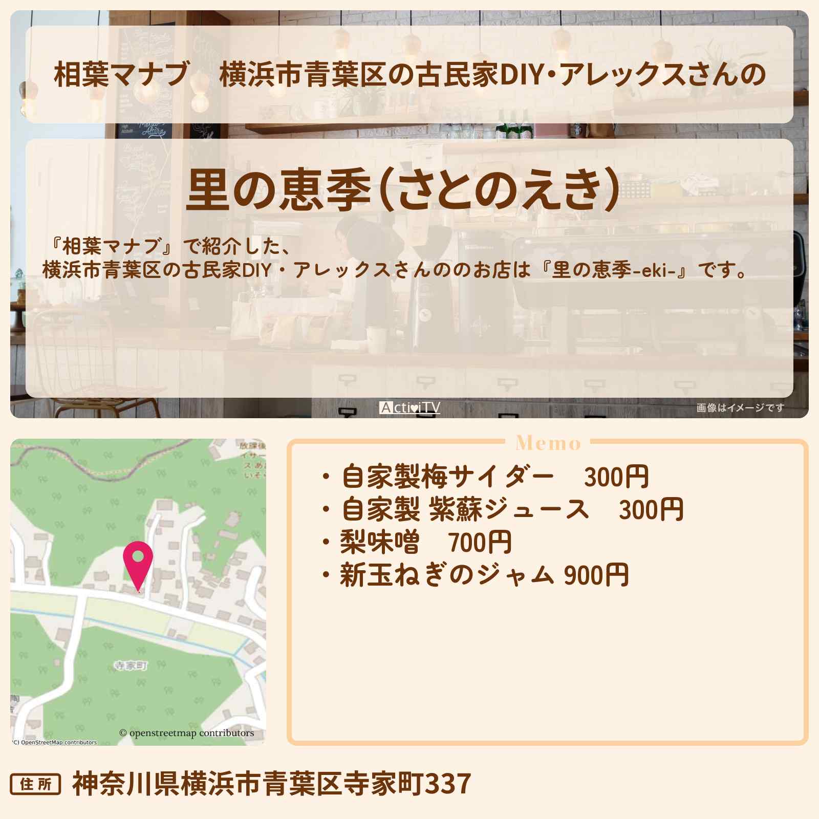 made in 寺家 販売所 「里の恵季 -eki-」 里のengawaで製造する加工食品をはじめ、寺家ふるさと村で作られている野菜や手仕事商品を集めた販売所です。火曜・日曜定休。営業時間10:00〜17:00。里山を望む飲食カウンターでは毎週木曜・金曜11:00〜14:00、ランチ営業もしています。 made in 寺家 飲食カウンター 焼き菓子・スイーツ ポップアップ 足湯 本日のクエスト 寺家産の農作物を使い、昔ながらの保存食や調味料を手作りの製法で瓶詰め加工食品をつくっています。余計な添加物は加えず、手間暇かけて丁寧につくる。素材そのものの風味が生きている。 「made in 寺家」ブランドを通じて、自然豊かな寺家の魅力を発信すると共に、世代や住む場所の違いを超えたさまざまな人たちをつなげ、寺家をもっと盛り上げていきたいと思っています。詳細はこちら。 飲食カウンター 木曜・金曜11:00〜14:00は、「食堂チポリーノ」さんが、地場のお野菜をたっぷり使った優しいランチプレートを提供してくれます。 それ以外の日も里のengawaの自家製ドリンクをお楽しみいただけます。 木曜・金曜以外や夜にもイベント営業することがあります。詳しくは、里の恵季 instagram でご確認ください。 ポップアップ 店内奥の小上がりスペースでは、月替わりでポップアップを開催しております。 木工や草木染めなどの手仕事作品をはじめ、古道具やリサイクル手芸品の販売など、魅力的な方々の商品をお預かりしています。 ひと月ごとにガラッと変わる空間をお楽しみください。 足湯 「はなれ」の前に腰掛けて、里山の風景を見ながら足湯を楽しめます。飲食カウンターでドリンクを買って、ゆったりとおしゃべりを楽しむのも◎。 足湯 300円 / タオル付き 500円 ご利用は里の恵季スタッフにお声がけください。 本日のクエスト 里のengawaの活動の中で、ちょっとお手伝いしてほしいことがある時、「本日のクエスト」が出されることがあります。お手伝いをしてくれた方にはちょっとしたお礼も。ちょこっと里山体験を楽しんでいってください。 本日のクエスト情報はinstagramにて。 madeinjike 「made in 寺家」ブランドを通じて 自然豊かな寺家の魅力、 寺家にいる農家さんや職人さんたちが作っている物を発信すると共に、様々な人たちがつながることを願っています。 営業日時:月・水・木・金・土 10:00-16:30 (木・金はランチ営業) 場所:神奈川県横浜市青葉区寺家町337 Instagram post 18084743275701125 【紫蘇シロップできました✨】 里の 【7月のポップアップはじまります】 【7月のポップアップ】