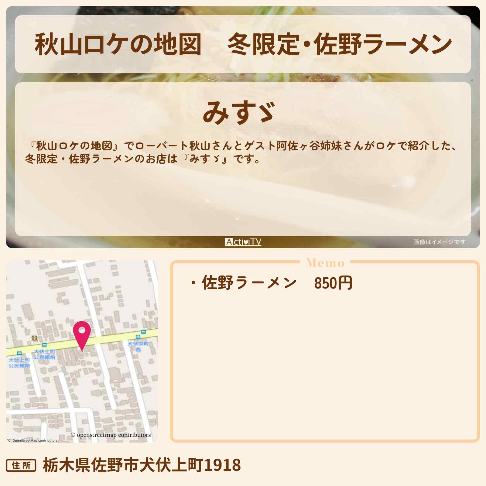 放送の【秋山ロケの地図】でローバート秋山さんとゲスト阿佐ヶ谷姉妹さんがロケで紹介した、冬限定・佐野ラーメンのお店は『みすゞ』です。