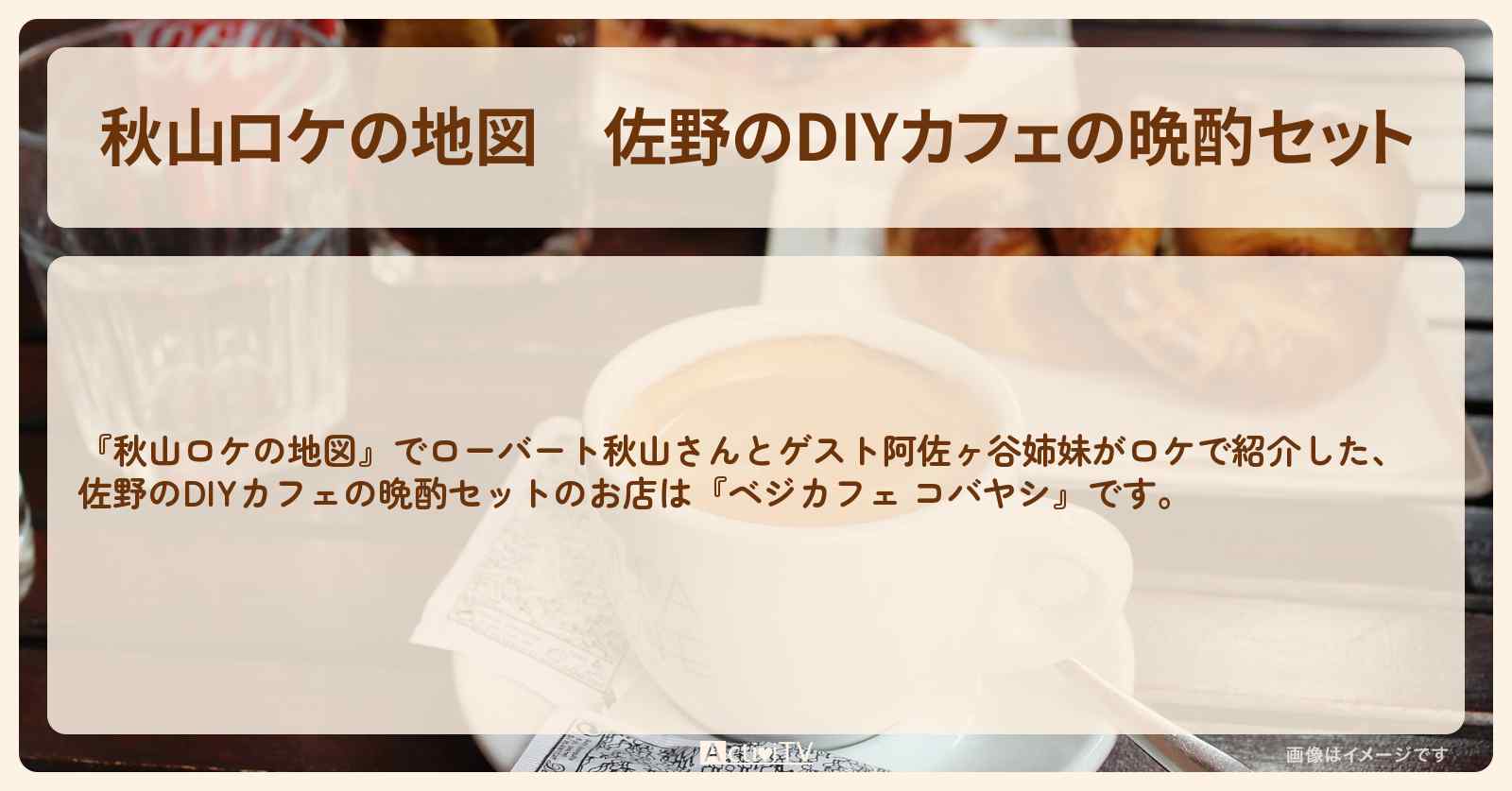 放送の【秋山ロケの地図】でローバート秋山さんとゲスト阿佐ヶ谷姉妹がロケで紹介した、佐野のDIYカフェの晩酌セットのお店は『ベジカフェ コバヤシ』です。