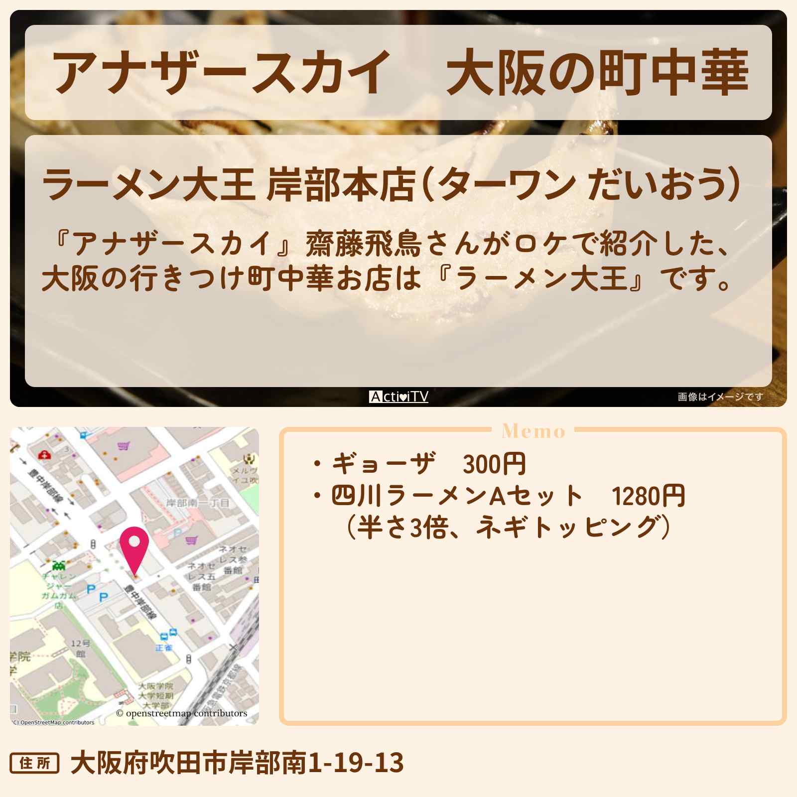 放送の【アナザースカイ】齋藤飛鳥さんがロケで紹介した、大阪の行きつけ町中華お店は『ラーメン大王』です。