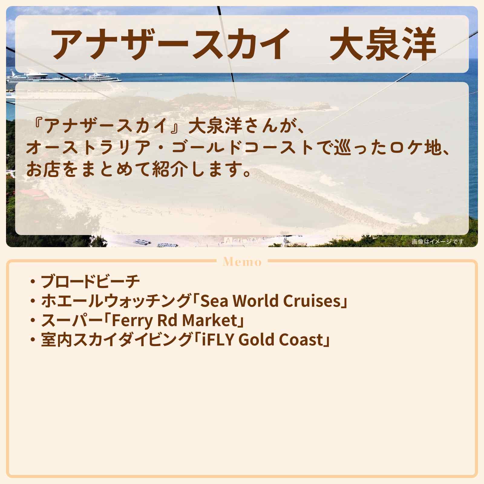 放送の【アナザースカイ】大泉洋さんが、オーストラリア・ゴールドコーストで巡ったロケ地、お店をまとめて紹介します。