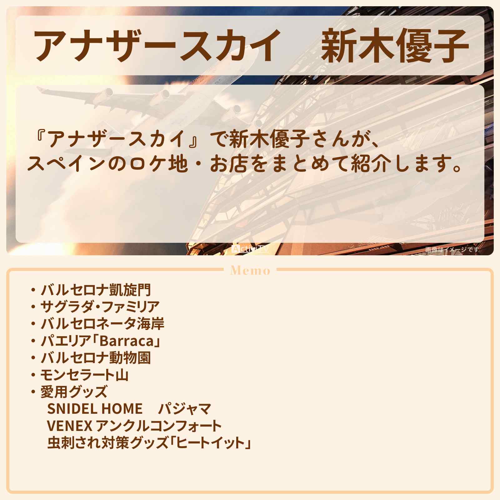 放送の【アナザースカイ】で新木優子さんが、スペインのロケ地・お店をまとめて紹介します。