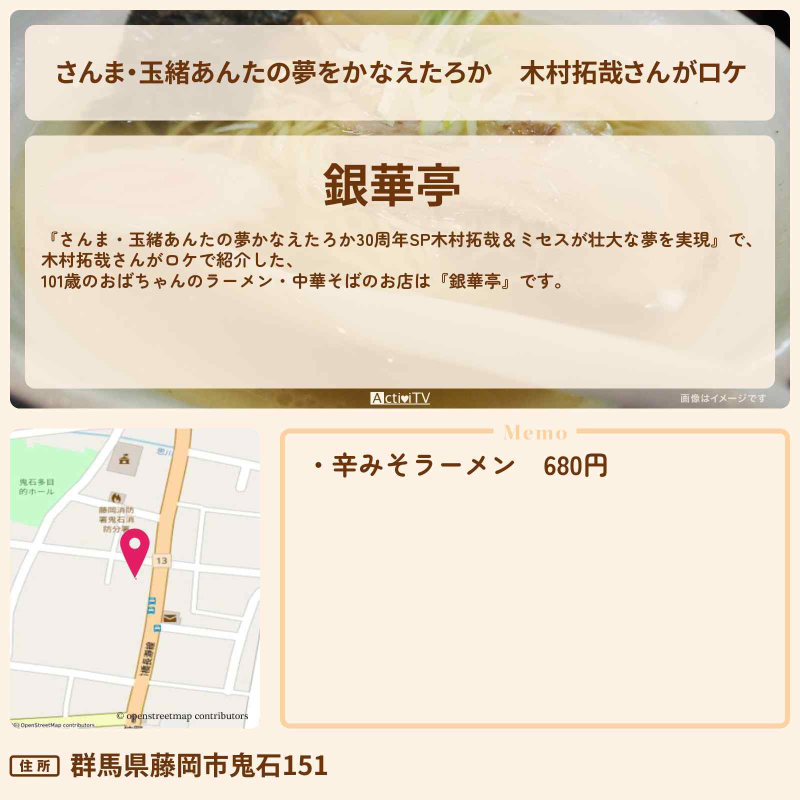 放送の【さんま・玉緒あんたの夢かなえたろか30周年SP木村拓哉&ミセスが壮大な夢を実現】で、木村拓哉さんがロケで紹介した、101歳のおばちゃんのラーメン・中華そばのお店は『銀華亭』です。