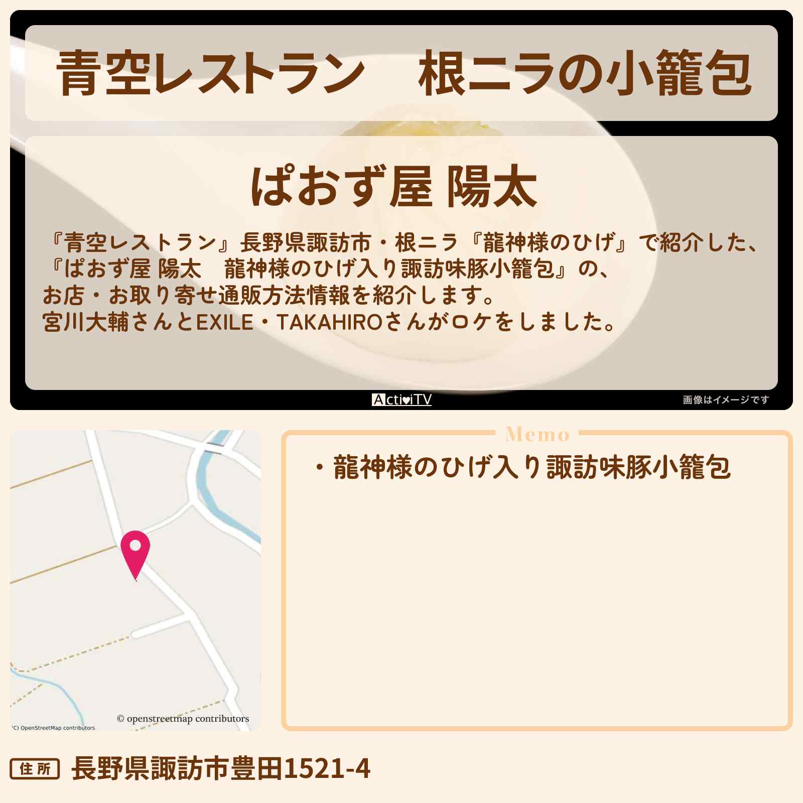 番組では根ニラ入りの『龍神様のひげ入り諏訪味豚小籠包』を堪能しました。