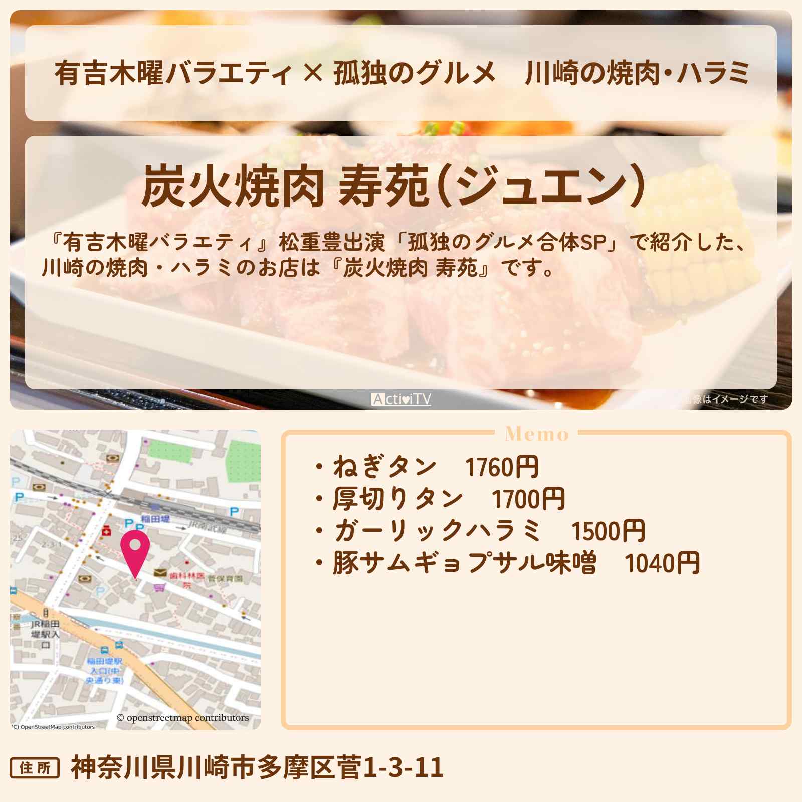 川崎の焼肉 稲田堤駅「炭火焼肉 寿苑(ジュエン)」