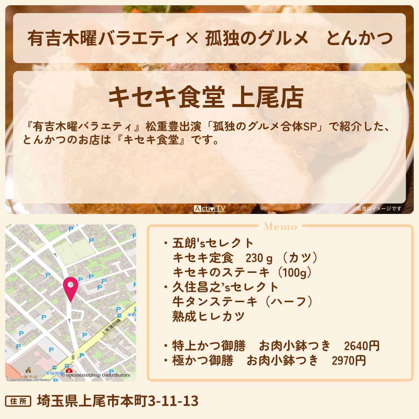 放送の【有吉木曜バラエティ】松重豊出演「孤独のグルメ合体SP」で紹介した、とんかつのお店は『キセキ食堂』です。