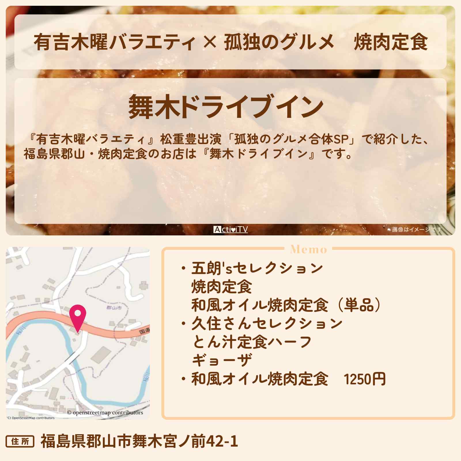 放送の【有吉木曜バラエティ】松重豊出演「孤独のグルメ合体SP」で紹介した、福島県郡山・焼肉定食のお店は『舞木ドライブイン』です。